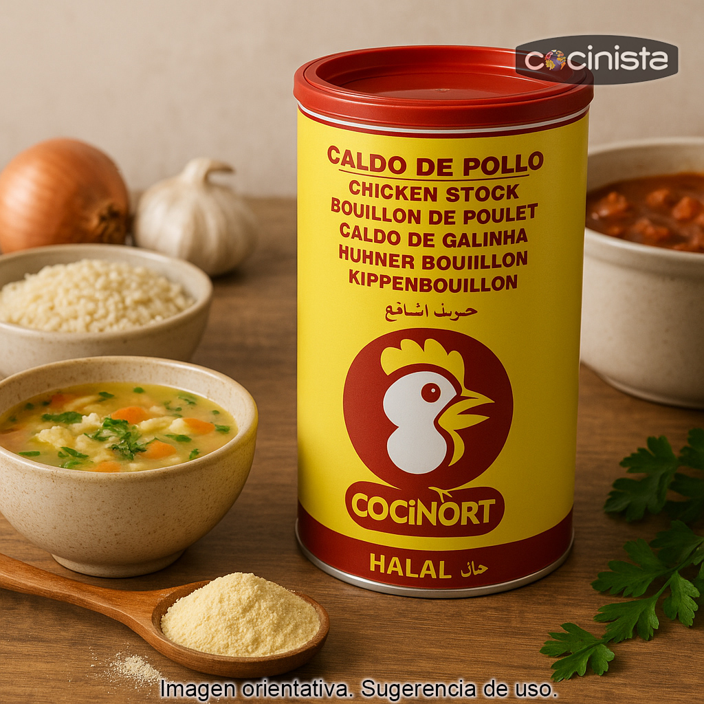 Concentrado de caldo de pollo en polvo (formato 1 kg), ideal para aportar un sabor intenso y un aroma casero a todo tipo de elaboraciones. Este caldo de pollo concentrado es una solución práctica para tener siempre a mano una base sabrosa con la que enriquecer sopas, guisos, arroces, salsas, estofados, legumbres y cualquier receta que necesite un toque extra de pollo.