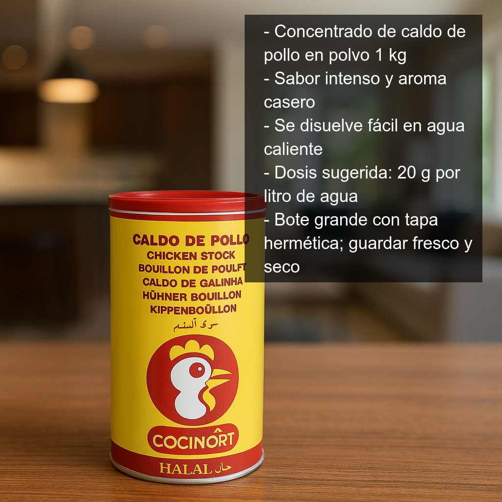Gracias a su formato en polvo, se disuelve fácilmente en agua caliente y permite ajustar la intensidad del sabor con precisión. Es perfecto tanto para uso doméstico como para cocinas profesionales, ya que el envase de 1 kg ofrece un rendimiento excelente y ayuda a optimizar tiempos en cocina sin renunciar al buen resultado.