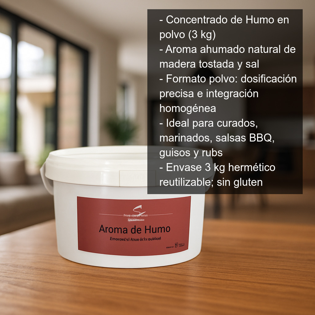 El Concentrado de Humo en polvo (3 kg) es un aroma ahumado natural ideal para aportar un toque de brasa y madera a tus elaboraciones sin necesidad de ahumar en frío o en caliente. Esta esencia de humo se obtiene a partir de madera cuidadosamente tostada y posteriormente mezclada con sal, logrando un perfil aromático intenso, limpio y muy versátil en cocina profesional y doméstica.