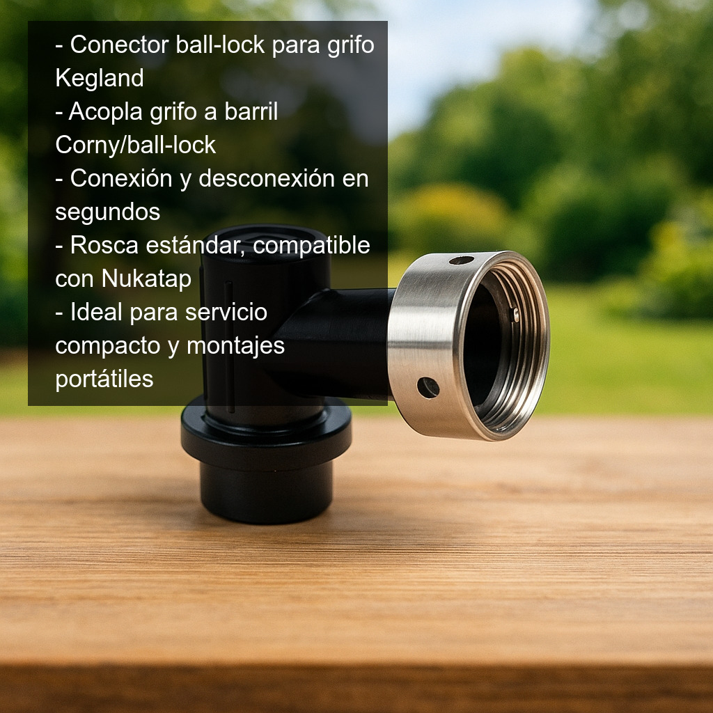 El conector ball-lock para grifo es un enganche estándar que permite acoplar rápidamente un grifo de cerveza a un barril tipo Corny (Cornelius) con conectores ball-lock, o a cualquier otro barril que utilice este mismo sistema. Es una solución práctica para montar un punto de servicio compacto, ideal tanto para uso doméstico como para elaboradores de cerveza artesanal que buscan un montaje limpio, fiable y fácil de usar.
