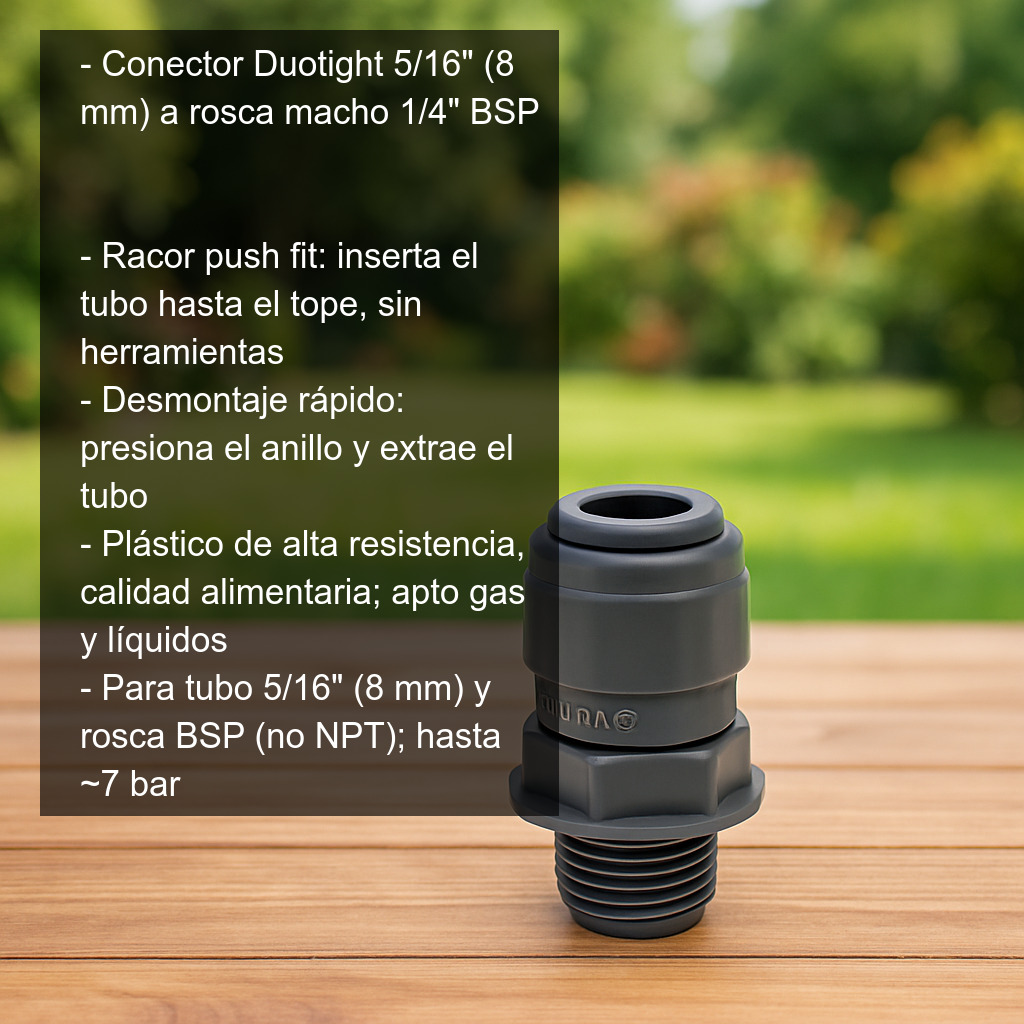 El conector Duotight para tubo 5/16" (8 mm) con rosca macho 1/4" BSP es un racor de conexión rápida tipo push fit diseñado para unir de forma segura y estanca una línea de tubo de 5/16" con un puerto roscado 1/4" BSP macho. Es una solución práctica para instalaciones de bebidas, agua y gas donde se busca un montaje rápido, limpio y fiable, sin abrazaderas ni herramientas especiales.