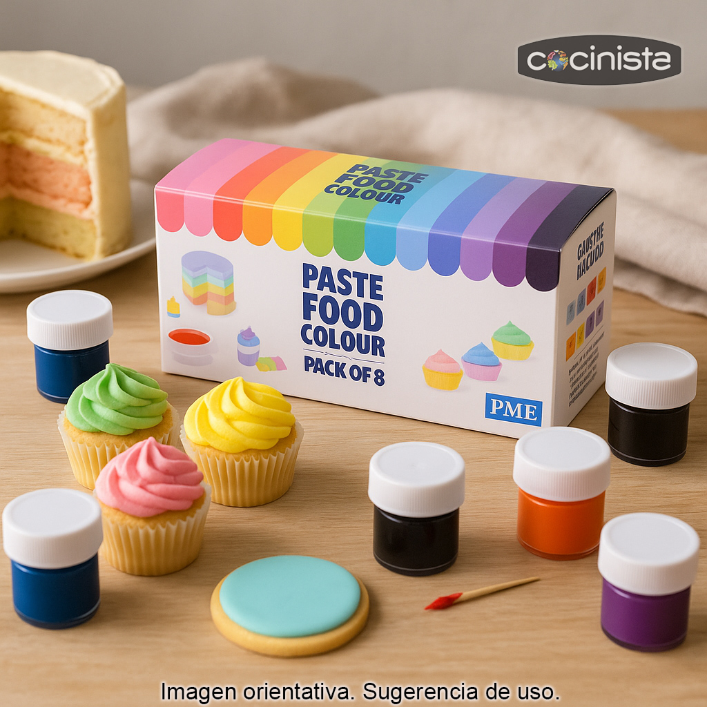 Colorantes alimentarios en pasta (set de 8 colores) para dar un acabado profesional a tus elaboraciones de repostería creativa. Este conjunto de colorantes concentrados es ideal para teñir masas de bizcocho, masas de galletas, glaseados, crema de mantequilla (buttercream), fondant, mazapán, pasta de azúcar y muchas otras preparaciones donde quieras conseguir tonos intensos sin alterar la textura.