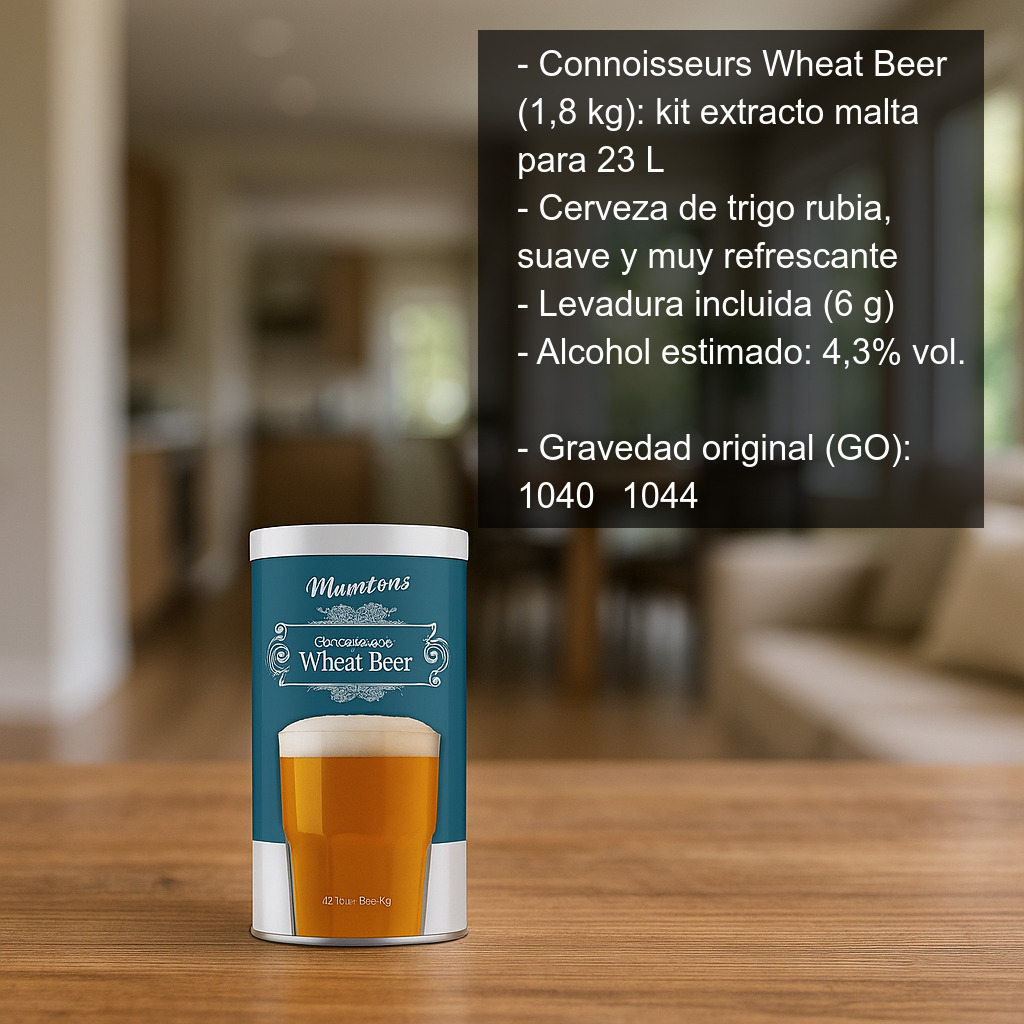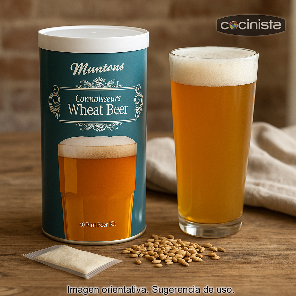 Connoisseurs Wheat Beer (1,8 kg) es un kit de extracto de malta pensado para elaborar en casa 23 litros de una cerveza de trigo (wheat beer) rubia, suave y muy refrescante. Dentro de la gama Connoisseurs, esta receta es una apuesta segura para quienes buscan una cerveza aromática, con buena espuma y un perfil fácil de disfrutar. Al ser de Muntons, contarás con una base de malta de calidad y resultados consistentes.