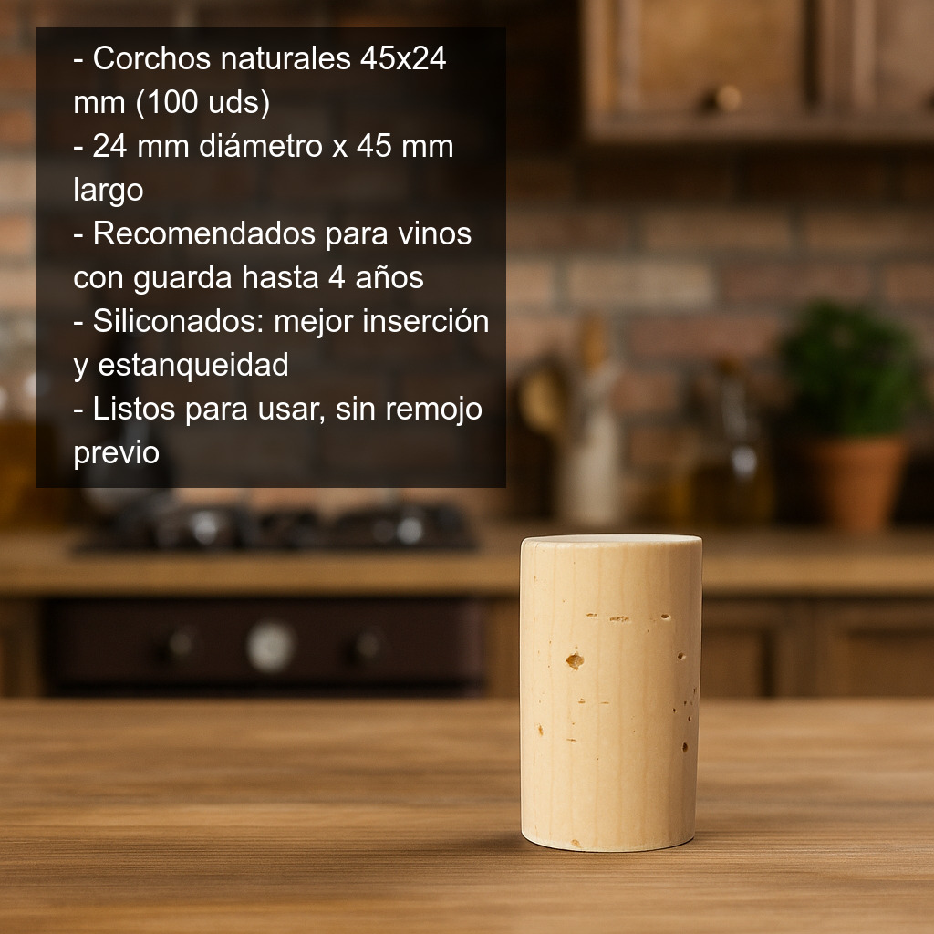 Estos corchos naturales 45x24 mm (24 mm de diámetro x 45 mm de largo) son una opción fiable y práctica para el embotellado de vino y otras elaboraciones caseras. Están especialmente recomendados para vinos de consumo relativamente temprano, ya que ofrecen un cierre adecuado para botellas que no vayan a permanecer más de 4 años en guarda.