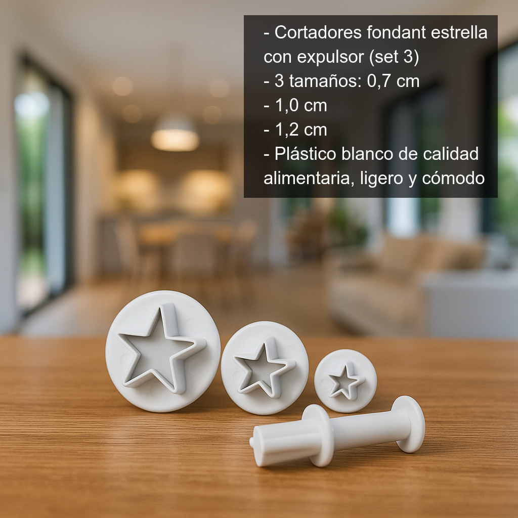 Conjunto de 3 cortadores para fondant en forma de estrella con expulsor, ideales para dar un acabado profesional a tus decoraciones de repostería. Fabricados en plástico blanco de calidad alimentaria, son ligeros, cómodos de usar y especialmente adecuados para cortar láminas finas de fondant y otras pastas similares.