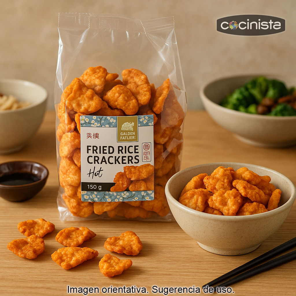 Estos crackers de arroz especiados se presentan en pequeños bocados fáciles de compartir, con un equilibrio entre el crujiente característico del arroz frito y un sabor intenso que combina muy bien con bebidas, salsas y platos salados. Son una opción práctica para tener siempre a mano en casa, en la oficina o para completar una mesa de aperitivos.
