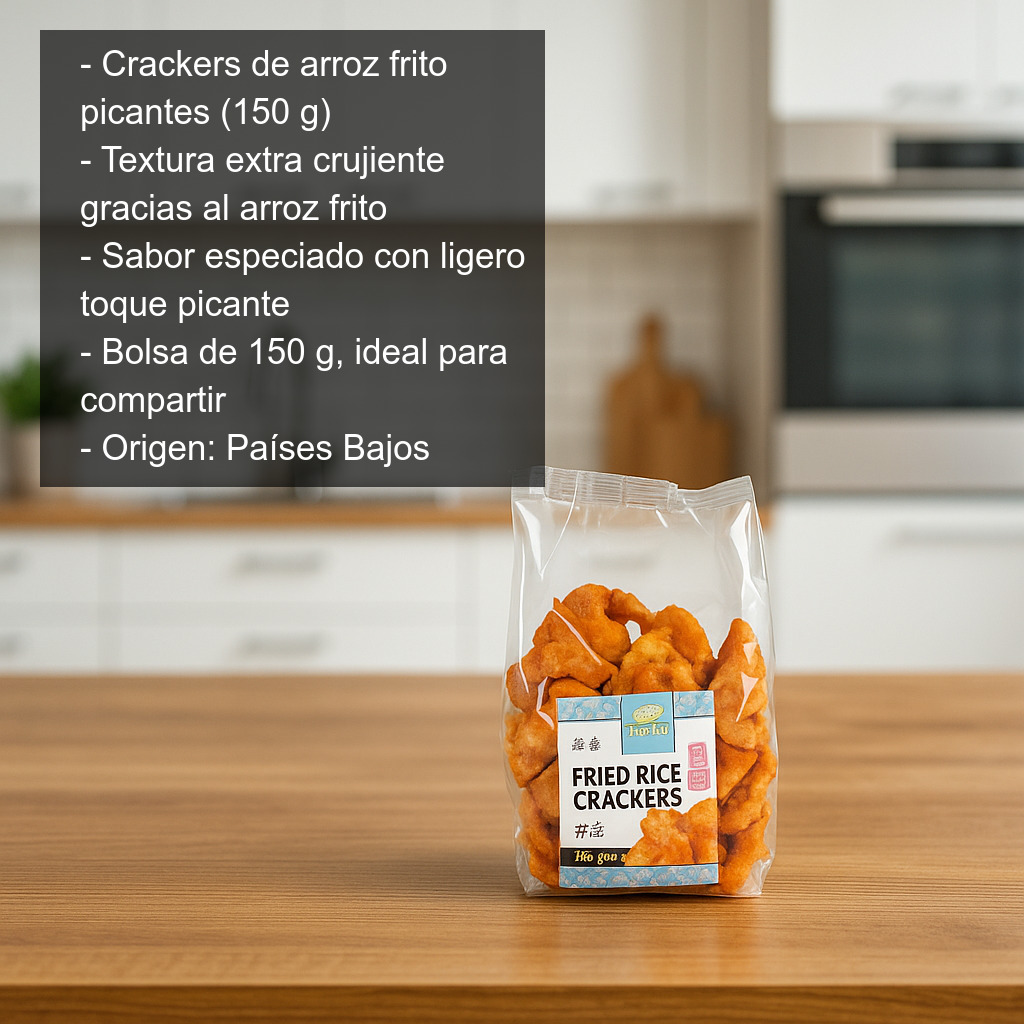 Los crackers de arroz frito picantes (150 g) son un aperitivo crujiente y lleno de sabor, ideal para quienes buscan un snack asiático con un toque especiado. Elaborados a partir de arroz y fritos para conseguir una textura ligera y muy crujiente, destacan por su punto picante suave y su mezcla de especias, perfectos tanto para un picoteo informal como para acompañar platos de inspiración oriental.