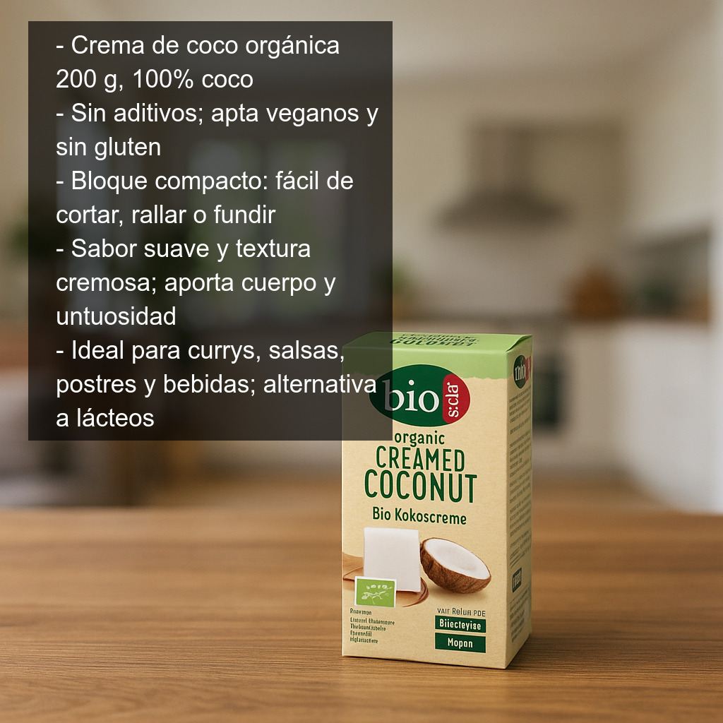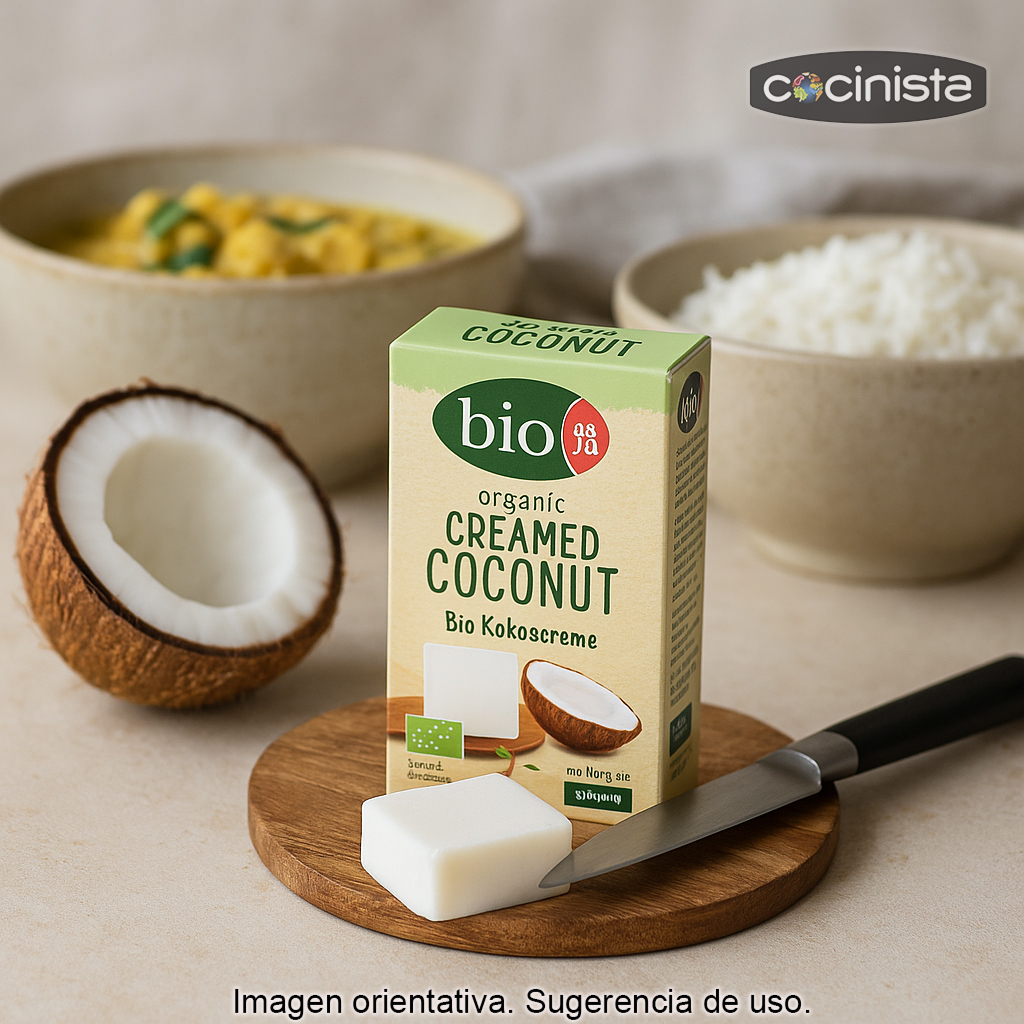 La crema de coco orgánica (200 g) está elaborada con 100% coco, sin aditivos ni ingredientes innecesarios. Se presenta en un bloque compacto y bastante sólido, lo que permite dosificarla fácilmente: puedes cortar la cantidad que necesites o fundirla para incorporarla a tus recetas.