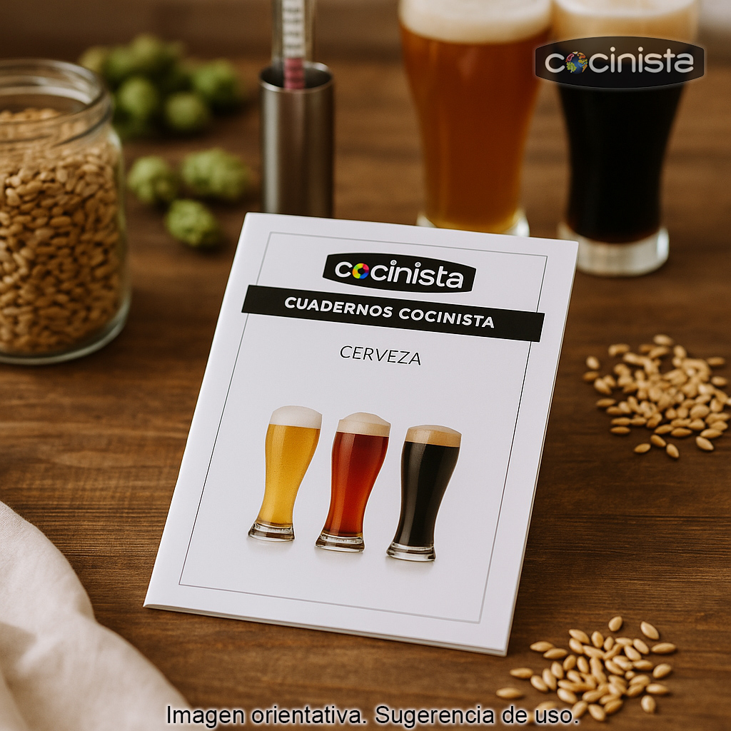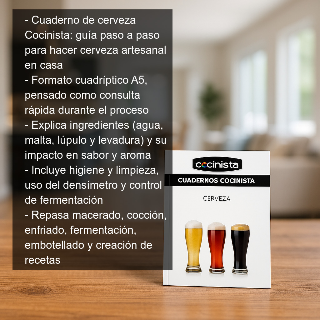 Cuaderno de cerveza Cocinista: un cuadernillo práctico y muy completo para aprender a elaborar cerveza artesanal en casa paso a paso. Diseñado como guía de consulta rápida, este folleto en formato cuadríptico A5 te acompaña desde los conceptos básicos hasta los detalles clave para mejorar tus resultados, tanto si empiezas desde cero como si ya has hecho tus primeras elaboraciones.