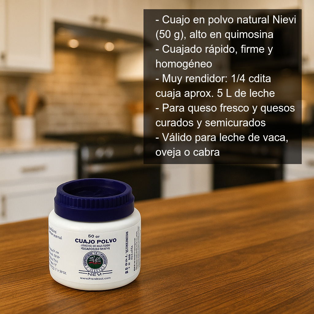 Cuajo en polvo natural (50 g) con alto contenido en quimosina, pensado para conseguir un cuajado rápido, firme y homogéneo. Es un ingrediente esencial en la elaboración de queso en casa y en pequeñas producciones, ideal tanto para queso fresco como para una amplia variedad de quesos curados y semicurados.