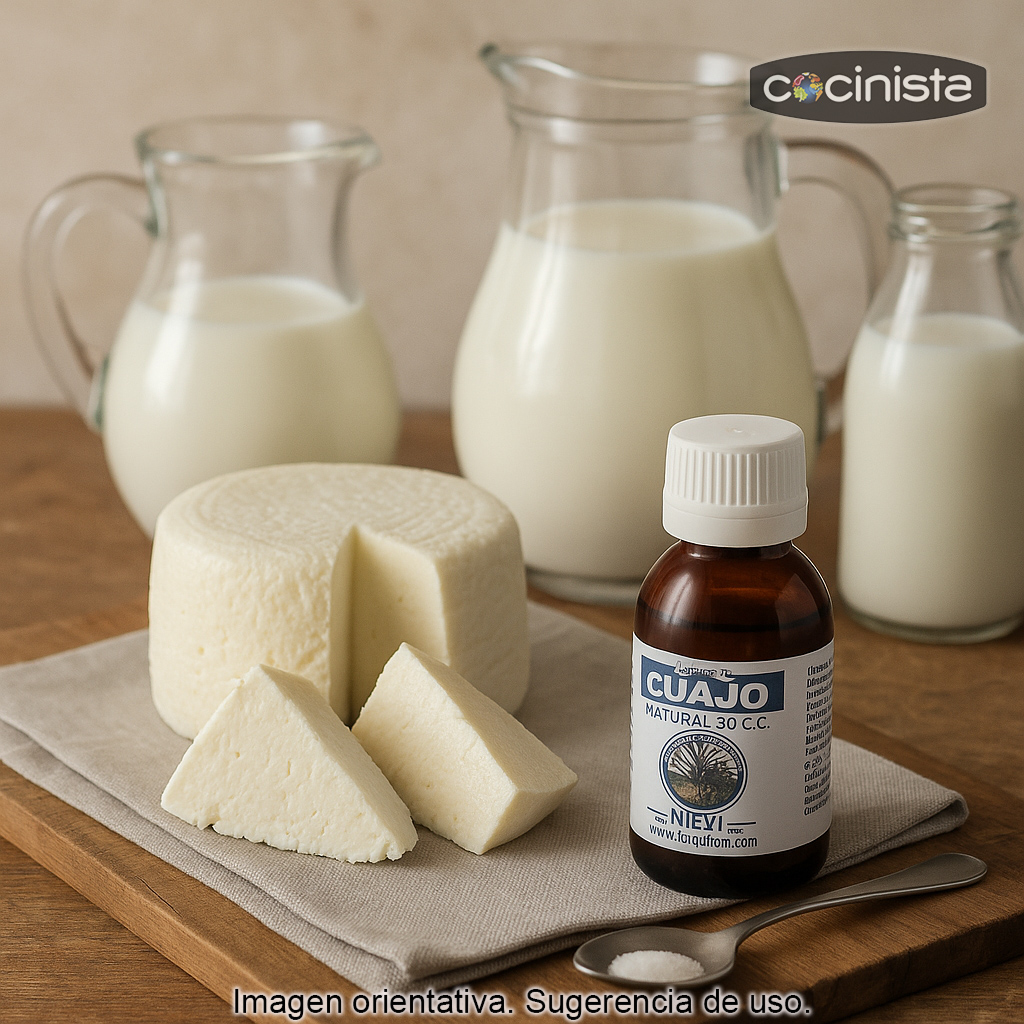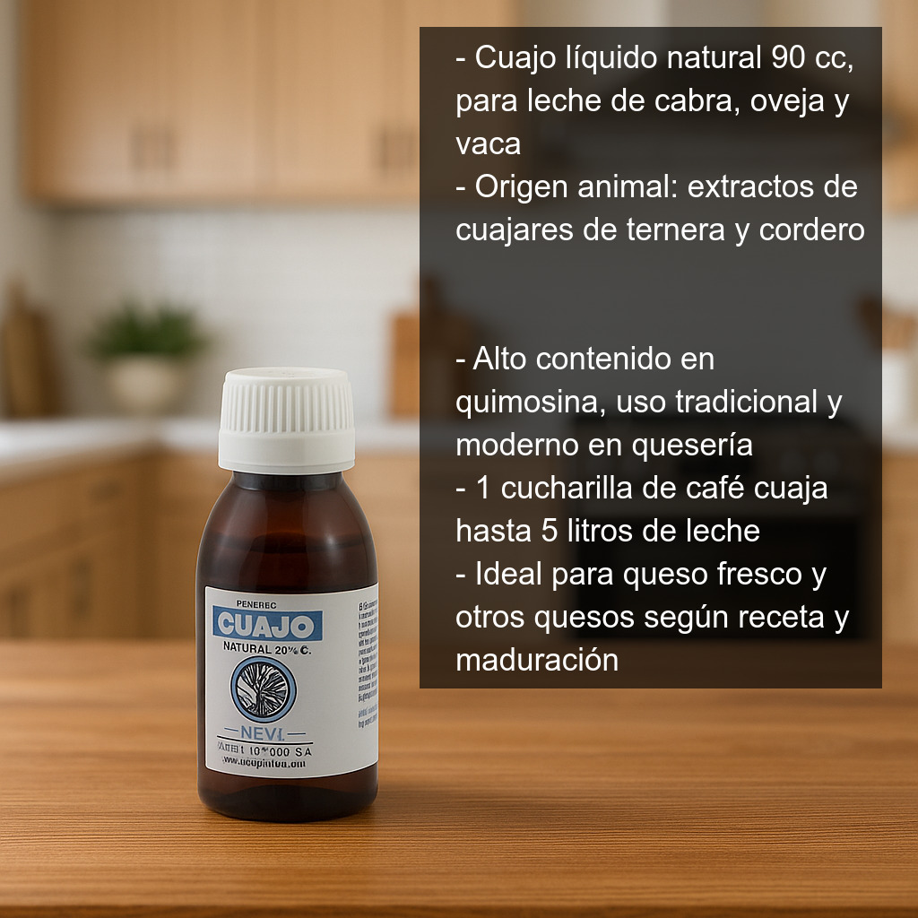 Cuajo líquido natural (90 cc) para cuajar leche de cabra, oveja y vaca. Un ingrediente esencial para elaborar queso casero con resultados fiables, ideal tanto para queso fresco como para otros tipos de quesos (semicurados y curados), siempre en función de la receta y del proceso de maduración.