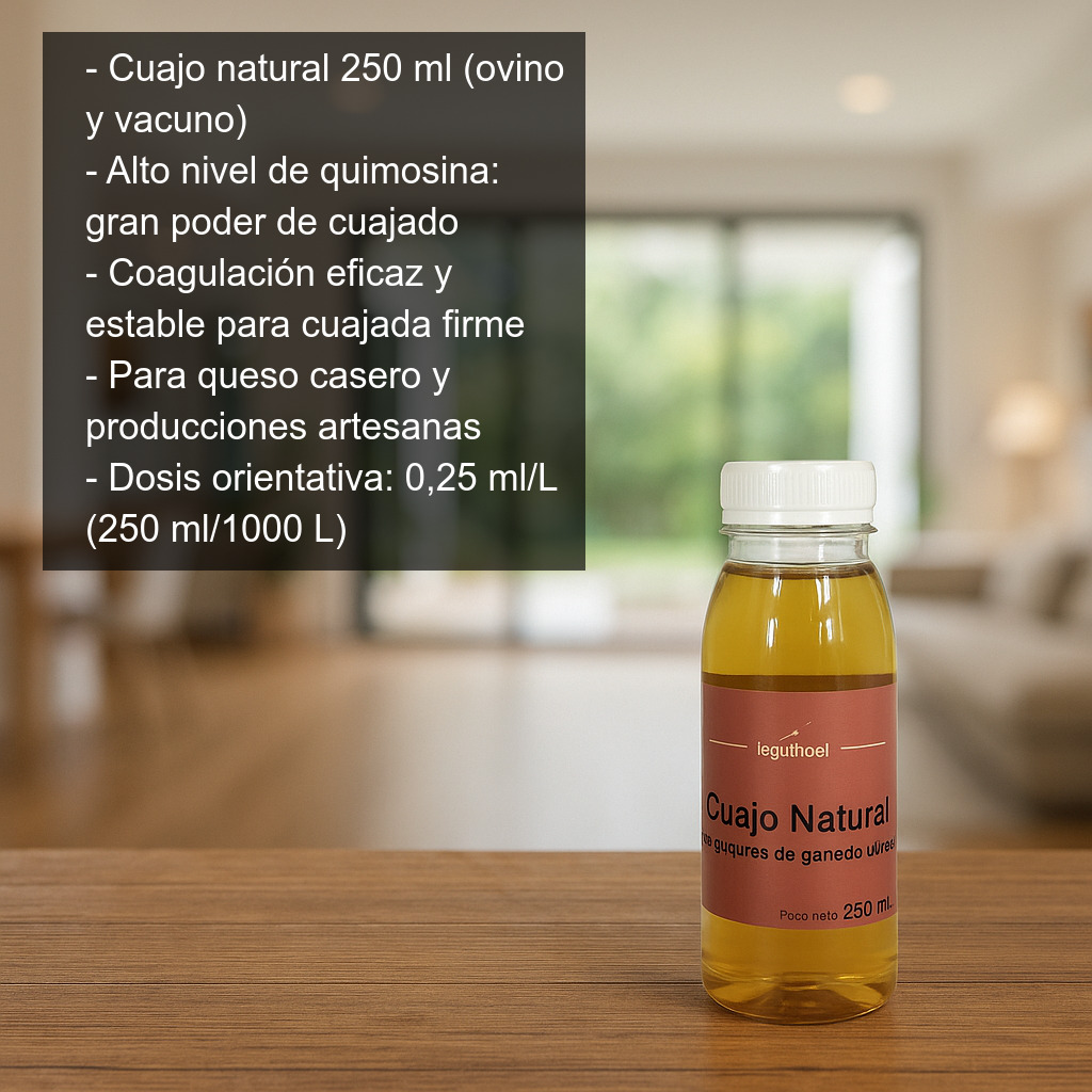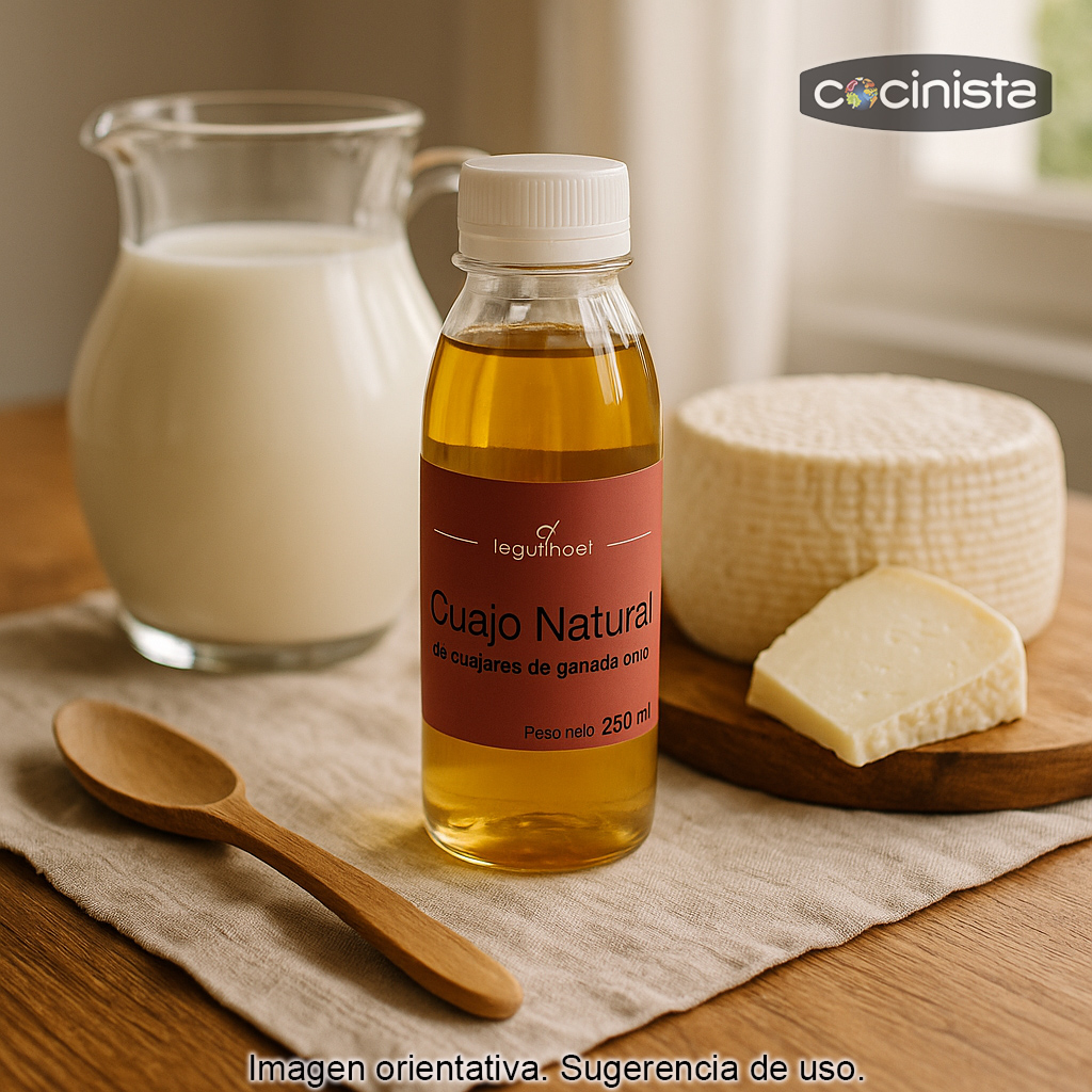 Cuajo natural (250 ml) elaborado a partir de extracto de cuajares de ovino y vacuno, con alto nivel de quimosina, lo que le confiere un gran poder de cuajado y una coagulación eficaz y estable. Es un ingrediente esencial para la elaboración de queso casero y para producciones artesanas, especialmente indicado para trabajar con leche de vaca, oveja o cabra.