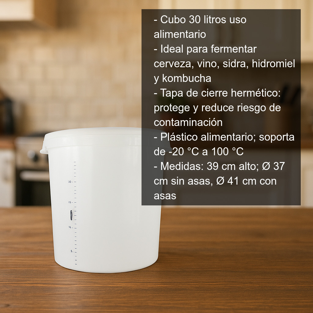 El cubo de 30 litros es un recipiente práctico y resistente para tus elaboraciones caseras. Diseñado para uso alimentario, es ideal para conservar todo tipo de alimentos, secos y líquidos.