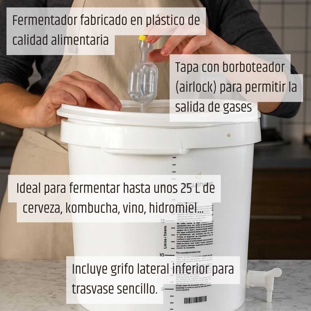 Cubo fermentador para cerveza, vino, hidromiel, kombucha, sidra,... Cuenta con grifo lateral en la parte inferior y válvula airlock (borboteador) para la salida de gases durante el fermentado. Se añade también un sobrecito con silicona alimentaria con el que sellar la rosca del grifo y evitar así fugas.