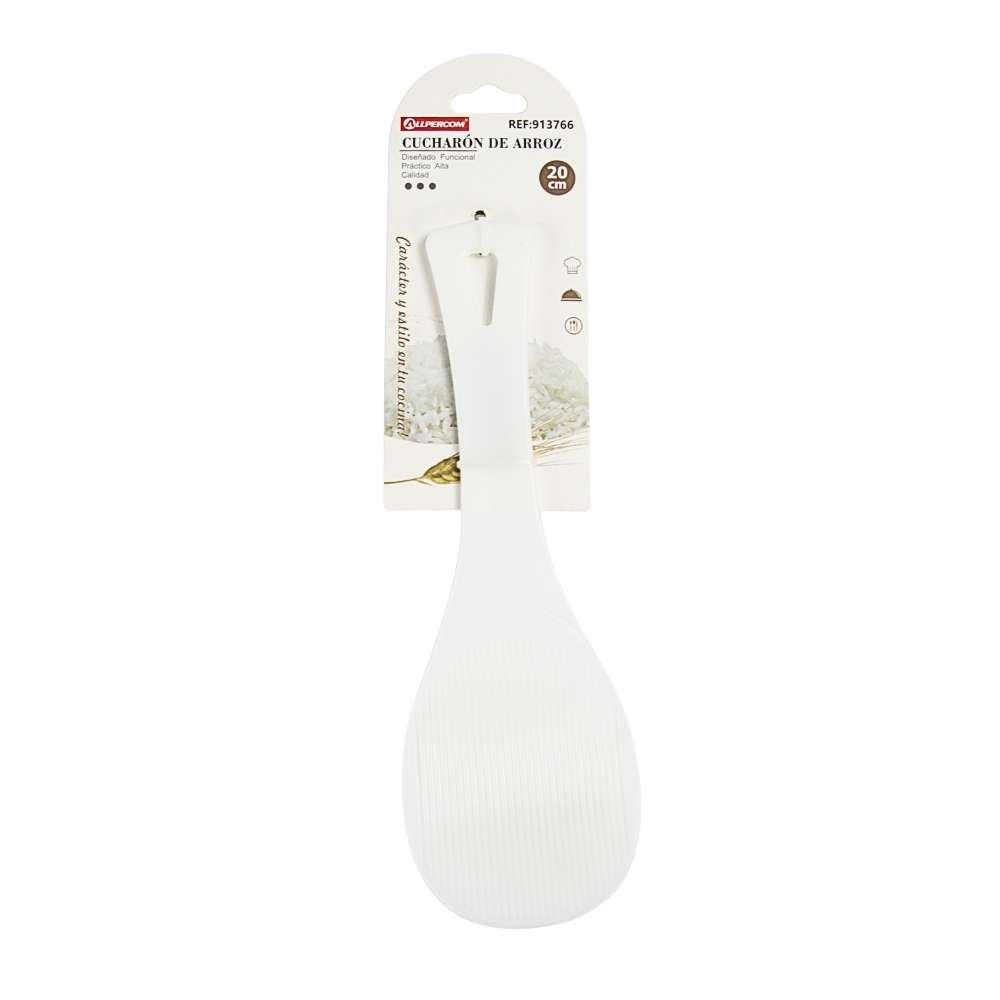 Cucharón o cuchara especialmente diseñado para servir arroz cocido sin que los granos se adhieran. Fabricado en material plástico resistente de calidad alimentaria, incorpora una superficie texturizada que reduce la adherencia y facilita el servicio de porciones uniformes. Su longitud de 20 cm ofrece un buen equilibrio entre comodidad y control, permitiendo manipular el arroz directamente desde cuencos, ollas arroceras o recipientes de servicio.