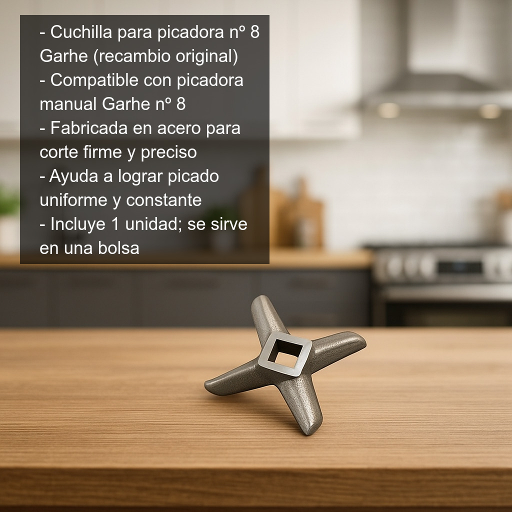 Compatibilidad: recambio pensado exclusivamente para la picadora manual Garhe nº 8. Si tienes dudas sobre el modelo, revisa la numeración de tu picadora antes de realizar la compra.