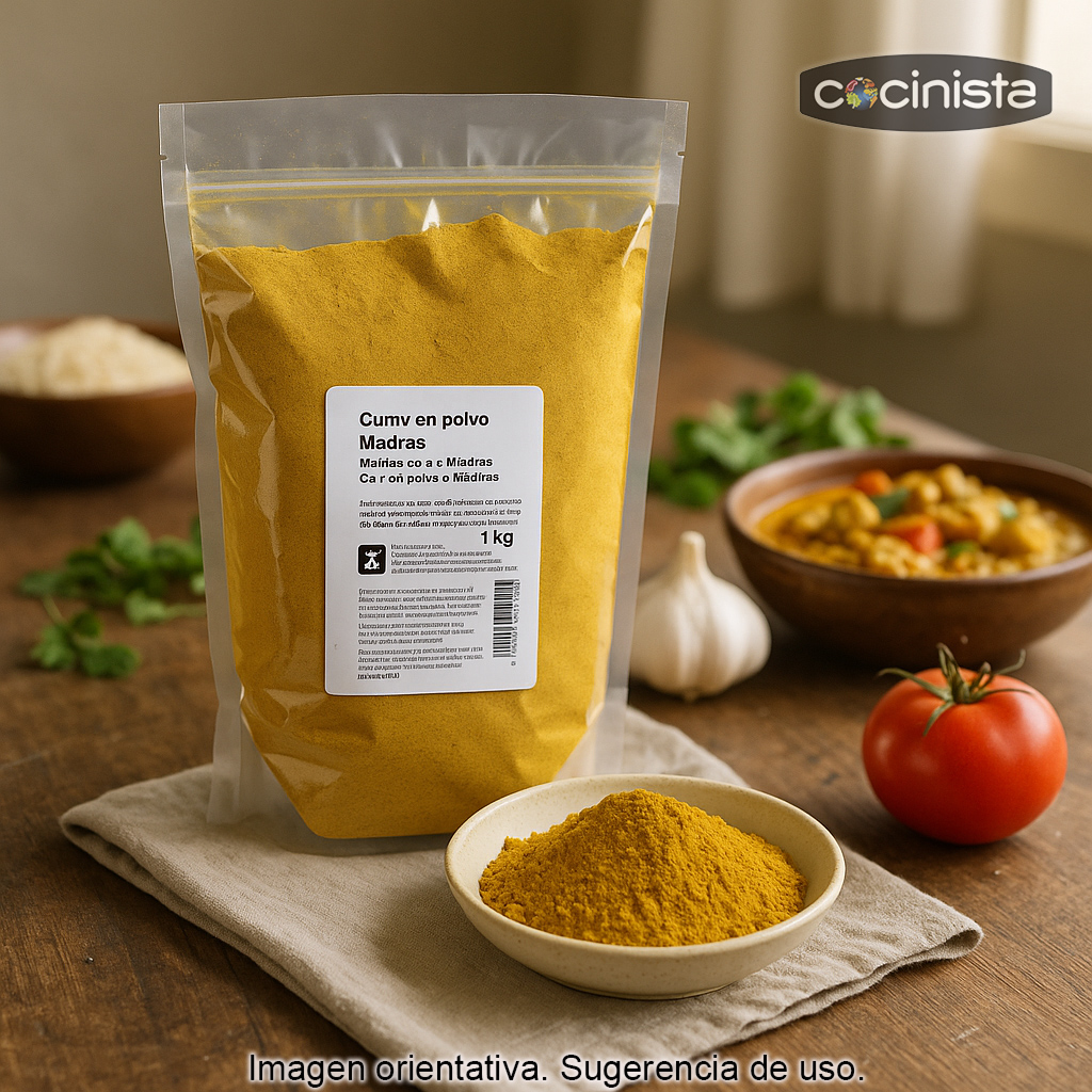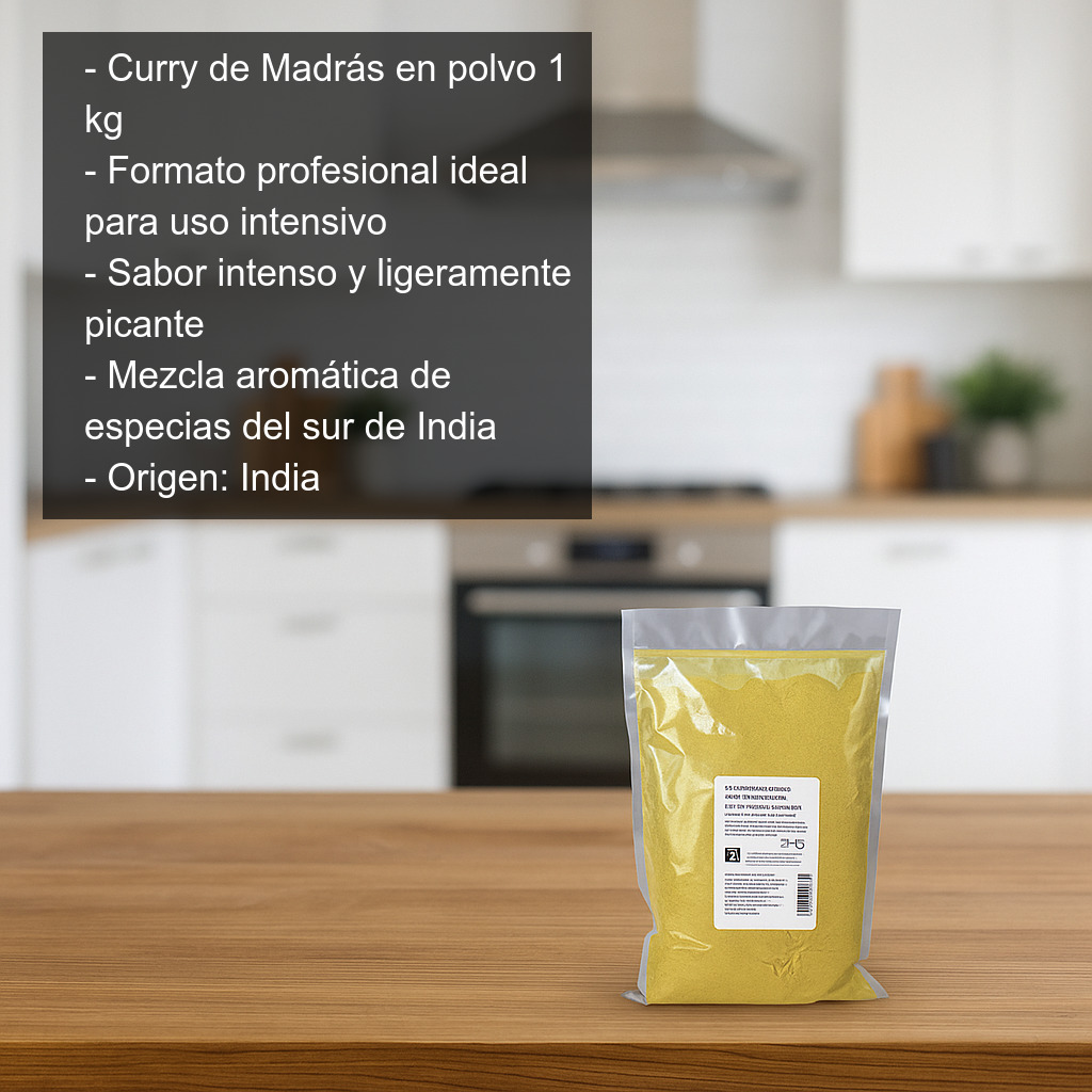 Mezcla de curry de Madrás en formato profesional. Este curry en polvo Madras se presenta en bolsa con 1 kg de producto, ideal para uso intensivo en cocina.