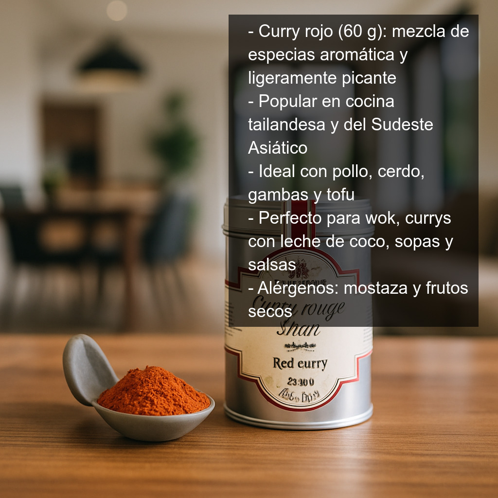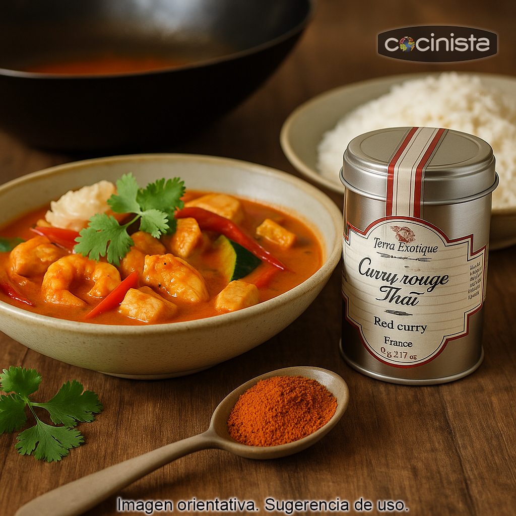 El curry rojo (60 g) es una mezcla de especias ligeramente picante e intensamente aromática, muy popular en la cocina de Tailandia y del Sudeste Asiático. Su sabor combina notas cálidas y especiadas con un toque exótico, ideal para preparar platos llenos de carácter en pocos minutos.