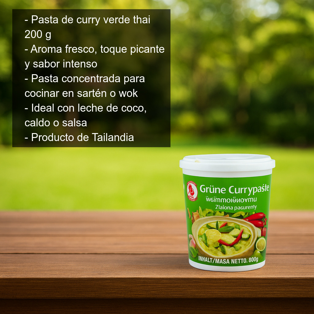 El curry verde en pasta es uno de los grandes clásicos de la cocina tailandesa, famoso por su aroma fresco, su toque picante y su sabor intenso. Con esta pasta de curry verde thai podrás preparar en casa, de forma rápida y sencilla, un auténtico Green Curry como el que se sirve en Tailandia: cremoso, fragante y lleno de matices.