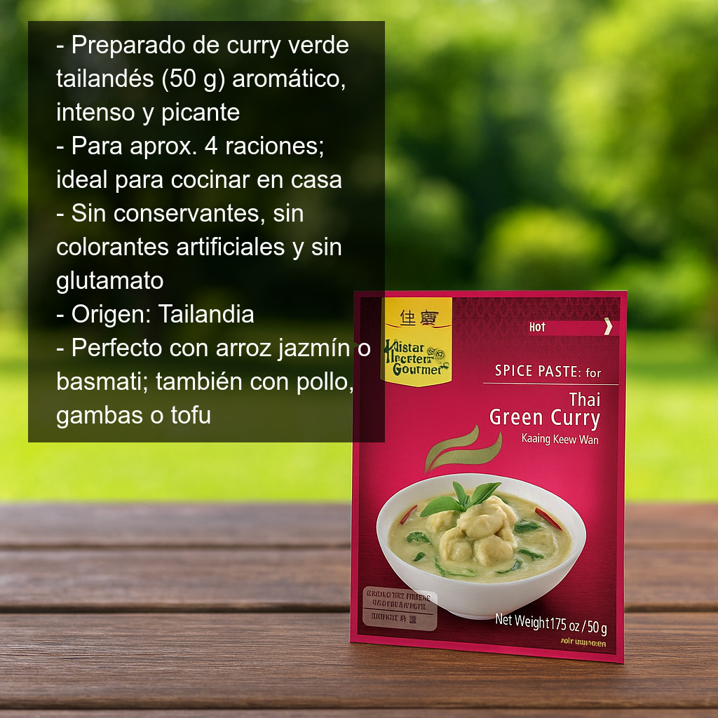 Descubre el sabor auténtico del curry verde tailandés con este preparado de especias (50 g), ideal para cocinar en casa uno de los platos más emblemáticos de la cocina Thai. Aromático, intenso y picante, este curry destaca por sus notas frescas y especiadas y es perfecto para acompañar con arroz jazmín o basmati.