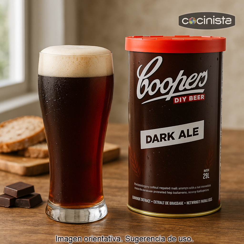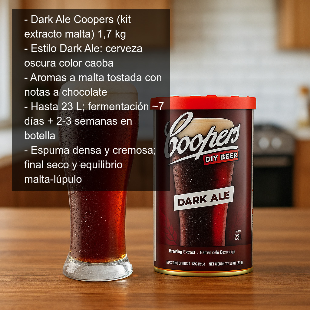 La Dark Ale Coopers es un kit de extracto de malta pensado para quienes buscan elaborar en casa una cerveza oscura con carácter, fácil de hacer y con un resultado muy agradecido desde las primeras semanas. Destaca por su intenso color caoba y una espuma densa y cremosa, típica de las ales oscuras bien equilibradas.
