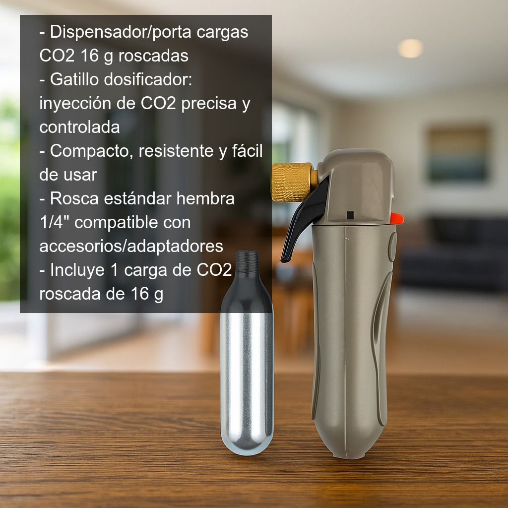 - Gatillo dosificador: control directo sobre la inyección de CO2, con respuesta inmediata.