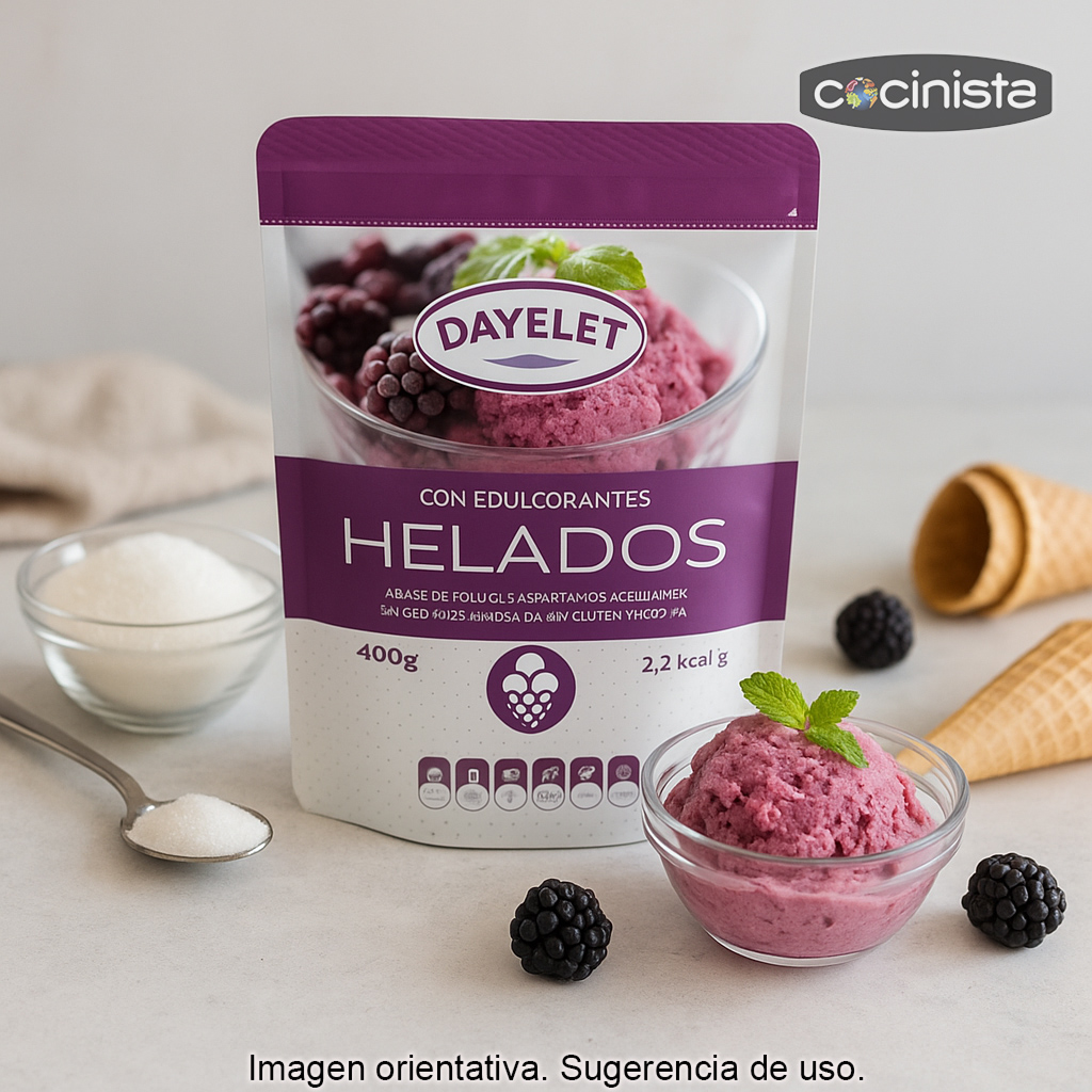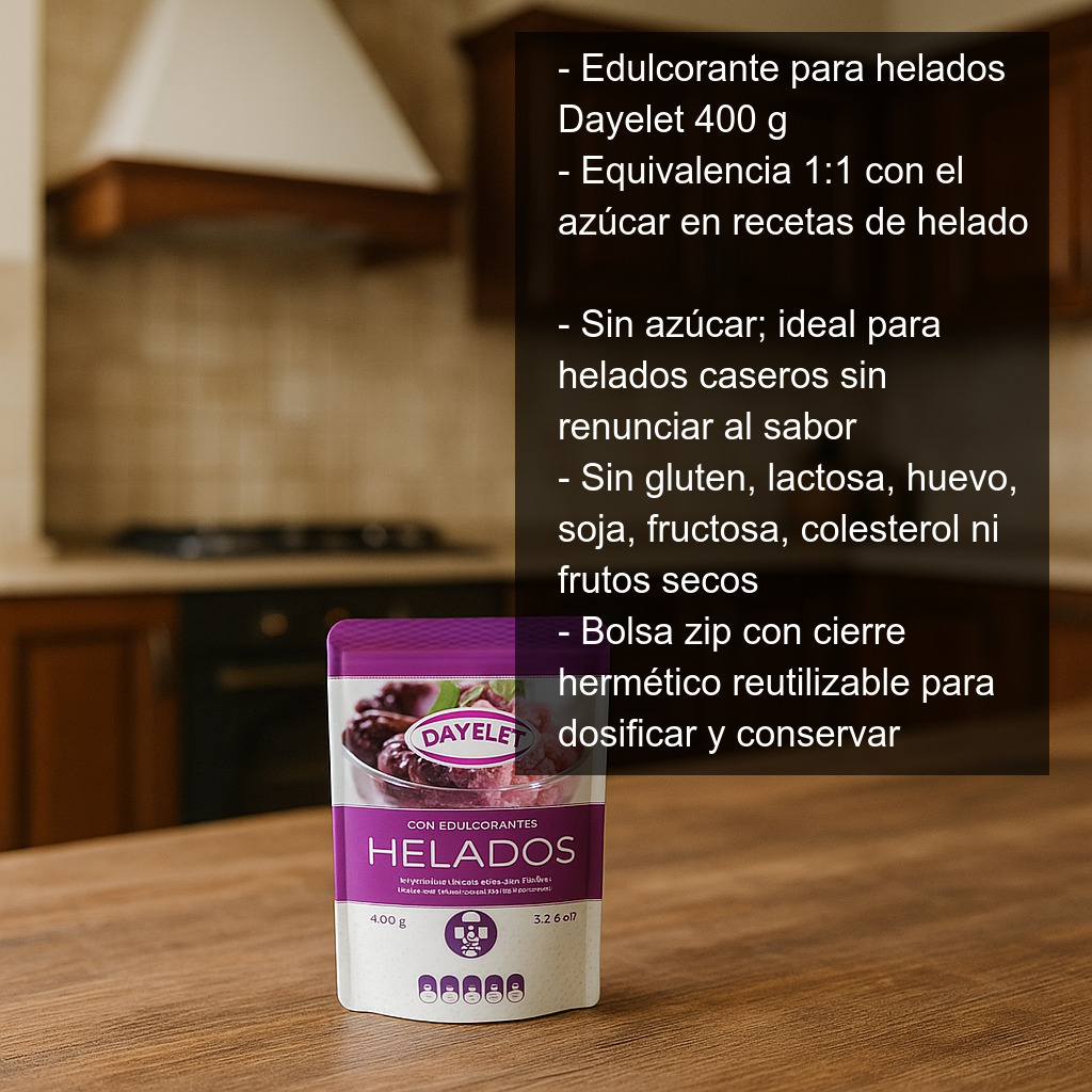 El edulcorante para helados Dayelet (400 g) es un endulzante especialmente formulado para la elaboración de helados caseros y recetas de heladería, pensado para sustituir el azúcar manteniendo un resultado dulce y equilibrado. Es una opción ideal si buscas preparar helados sin azúcar sin renunciar al sabor.