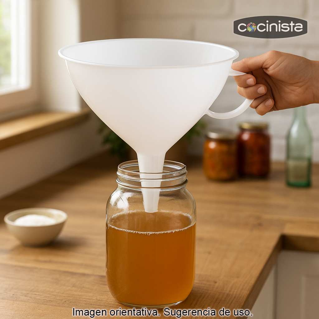 Además, su limpieza es sencilla: basta con enjuagarlo tras el uso (y, si lo necesitas, lavarlo con agua tibia y jabón) para dejarlo listo para la siguiente elaboración. Si buscas un embudo grande de cocina para trasvases cómodos, rápidos y limpios, este modelo de 30 cm es una opción fiable para tu cocina o tu taller de elaboración casera.