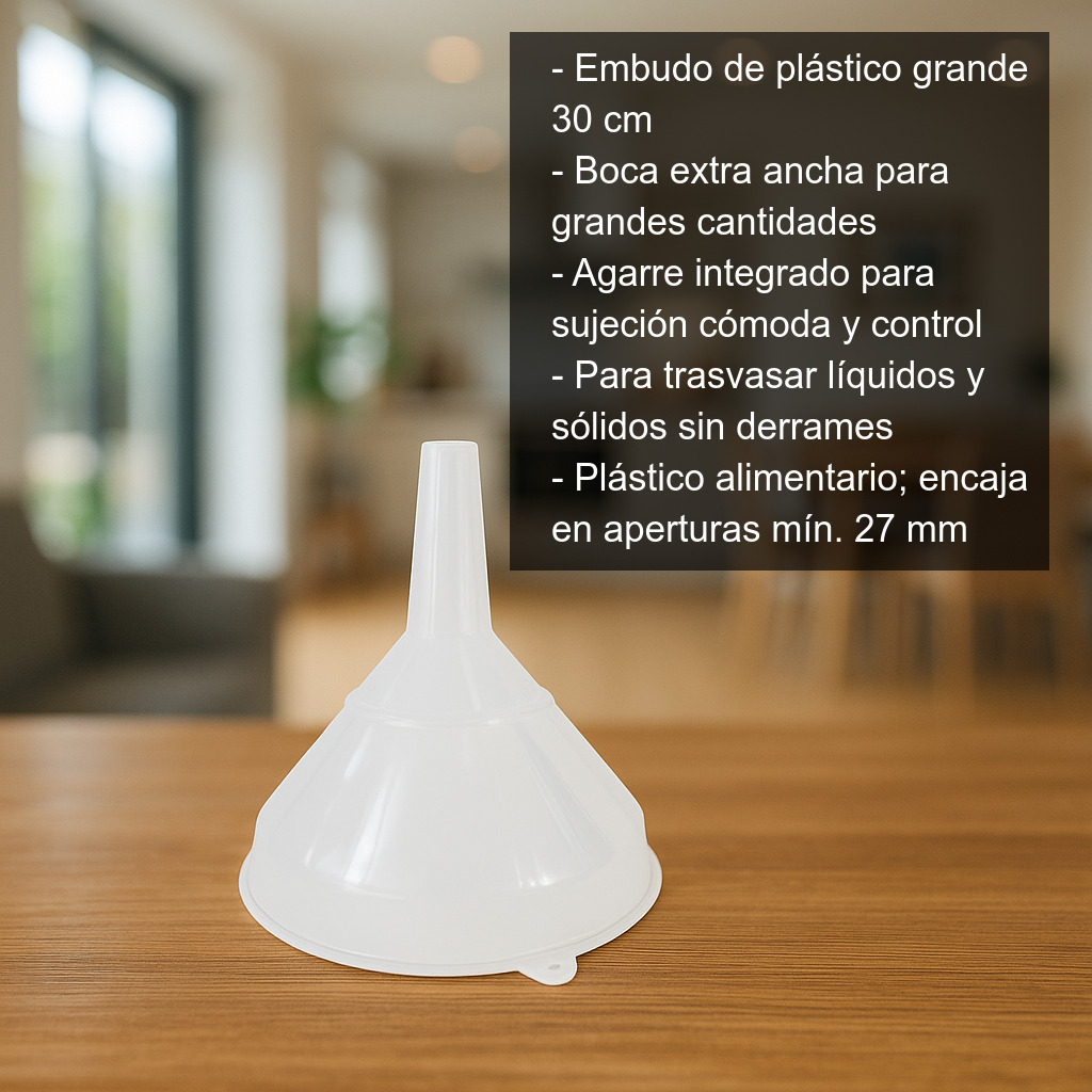 El embudo de plástico grande (30 cm) es un accesorio práctico y resistente para trasvasar líquidos e ingredientes con rapidez y sin derrames. Su boca extra ancha facilita el llenado de recipientes cuando trabajas con grandes cantidades, y el sistema de agarre integrado permite sujetarlo con comodidad y mayor control durante el uso.