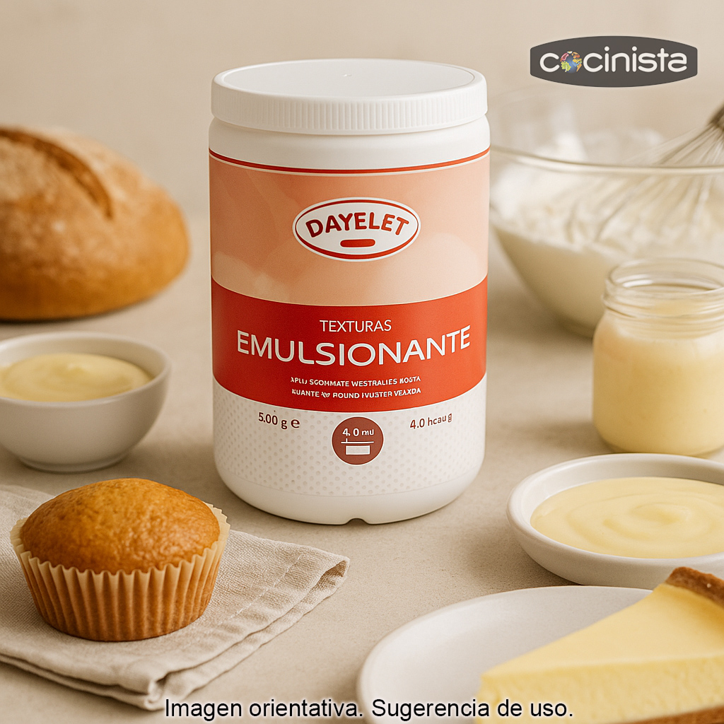 El emulsionante en pasta Dayelet (500 g) es un ingrediente profesional “todoterreno” pensado para mejorar la textura, la estabilidad y el volumen de una gran variedad de elaboraciones dulces y saladas. Su función principal es favorecer la unión entre fases que normalmente no se mezclan bien (como grasa y agua), ayudando a conseguir preparaciones más homogéneas, finas y con un acabado más agradable en boca.