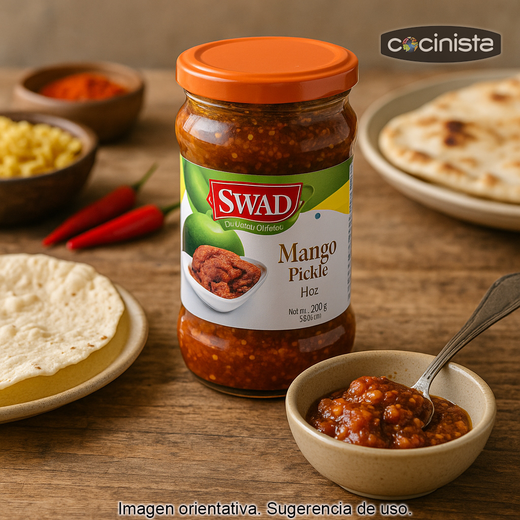 Este pickle de mango es muy versátil: aporta profundidad, aroma y un toque picante a recetas de inspiración india y también a platos del día a día. úsalo en pequeñas cantidades, ya que su sabor es concentrado.