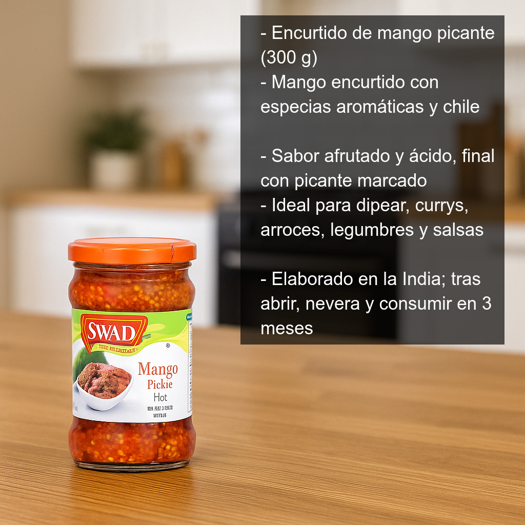 El encurtido de mango picante (300 g) es un condimento tradicional de la cocina india, elaborado con mango encurtido y una mezcla aromática de especias y chile. Su sabor combina el punto afrutado y ácido del mango con notas intensas y especiadas, terminando con un picante marcado. Ideal para quienes buscan un toque exótico y potente en aperitivos y platos salados.