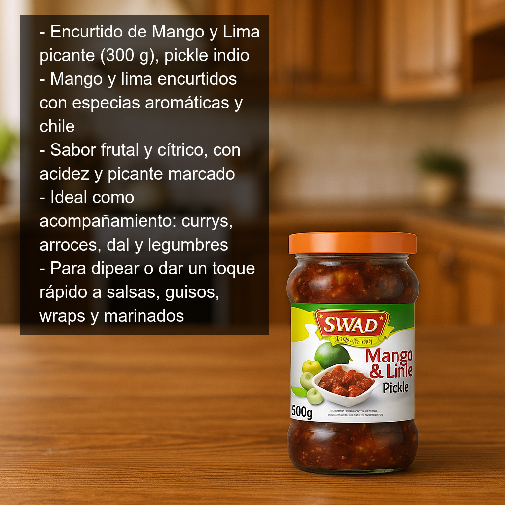 El Encurtido de Mango y Lima picante (300 g) es un pickle indio lleno de sabor, elaborado a partir de mango y lima encurtidos y mezclados con especias aromáticas y chile. El resultado es un condimento intenso, con un equilibrio delicioso entre el toque frutal del mango, la acidez de la lima y un picante marcado que realza cualquier plato.