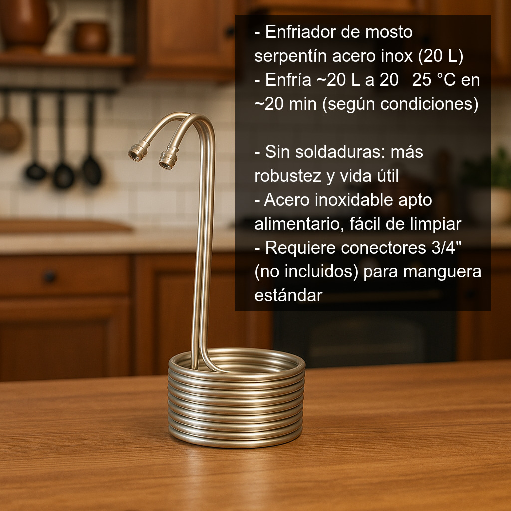 El enfriador de mosto tipo serpentín de acero inoxidable (20 L) es un accesorio imprescindible para elaborar cerveza en casa con seguridad y consistencia. Su función es reducir rápidamente la temperatura del mosto tras la ebullición, ayudando a minimizar el riesgo de contaminación y favoreciendo una mejor calidad final de la cerveza.