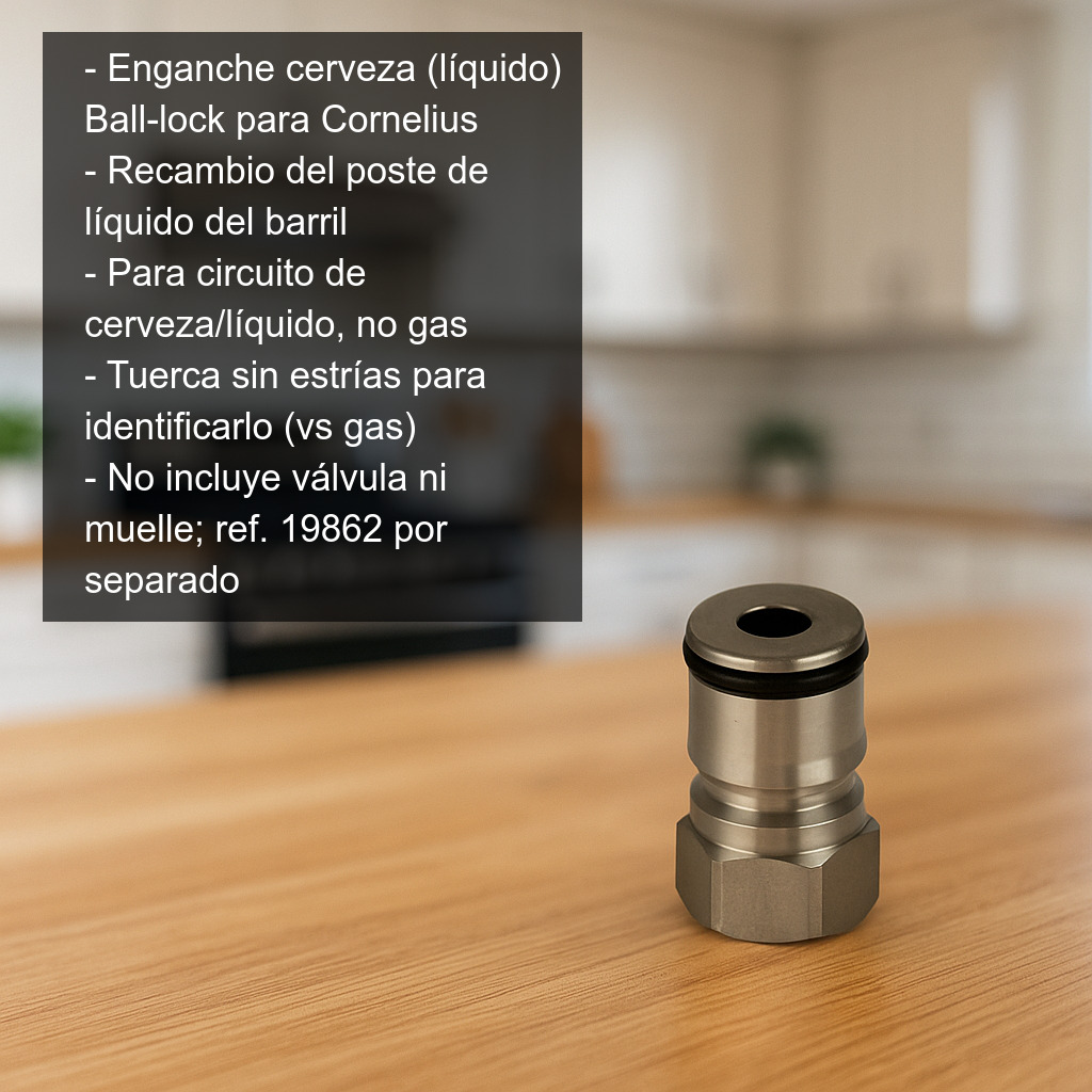 Este enganche de cerveza (salida de líquido) para conector Ball-lock es un recambio para barriles tipo Cornelius (también conocidos como corny o corni). Está diseñado para sustituir el enganche del poste de líquido del barril y recuperar un acople seguro y estanco con los conectores Ball-lock, ideal para sistemas de tiraje y dispensado de cerveza casera.