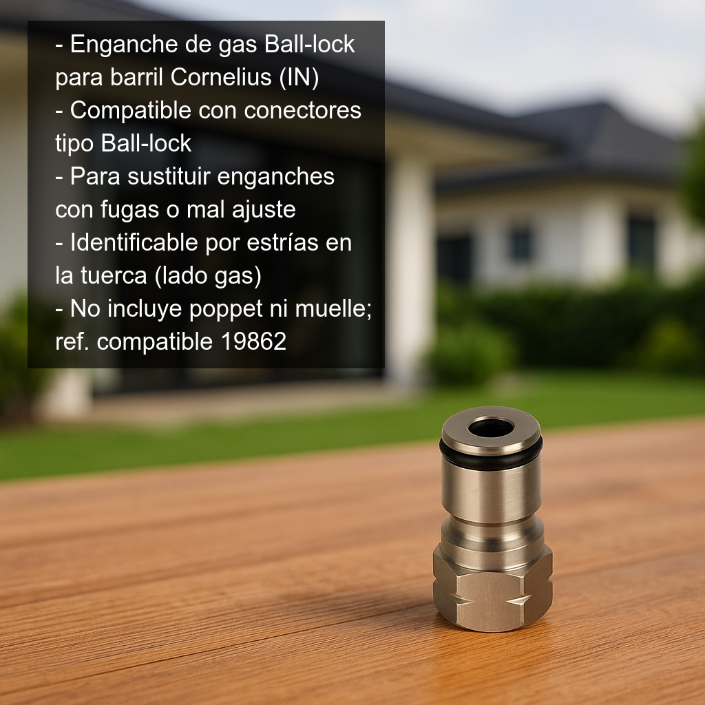 El enganche de gas para conector Ball-lock es un recambio para barriles Cornelius (también conocidos como corny o corni) destinado a la entrada de gas (IN). Es compatible con los conectores tipo Ball-lock y está pensado para sustituir un enganche deteriorado, con fugas o que no ajusta correctamente, recuperando un sellado fiable en tu sistema de carbonatación y servicio.