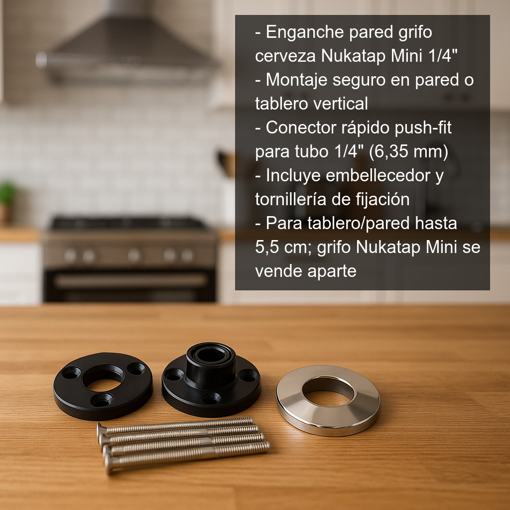 El enganche de pared para grifo de cerveza Nukatap Mini 1/4" es el kit ideal para montar un grifo Nukatap Mini (ref. 19811) en una superficie vertical de forma segura, limpia y profesional. Es una solución perfecta para instalaciones de tirador de cerveza en casa, kegerators, cámaras de frío, barras domésticas o proyectos de dispensación en eventos.