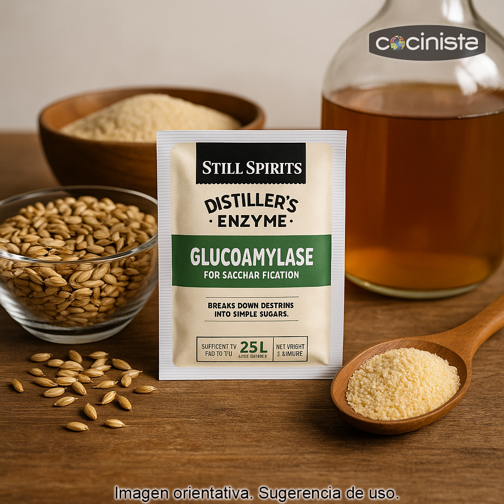 La enzima Glucoamilasa (también conocida como amiloglucosidasa) es un ingrediente clave para quienes buscan maximizar la conversión de almidones en azúcares fermentables y obtener fermentaciones más completas al elaborar destilados como whisky, ron, vodka o ginebra a partir de cereales u otras materias primas ricas en almidón.