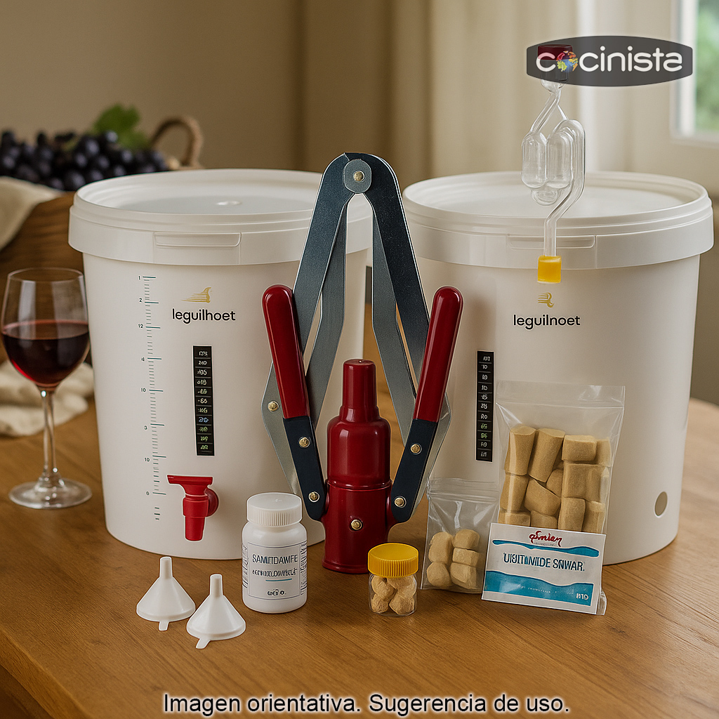 Recomendado para: elaboración de vino casero con kits de uva, aficionados que quieren un equipo completo para fermentar, trasvasar y embotellar, y usuarios que buscan mejorar la higiene y el control de temperatura durante la fermentación.