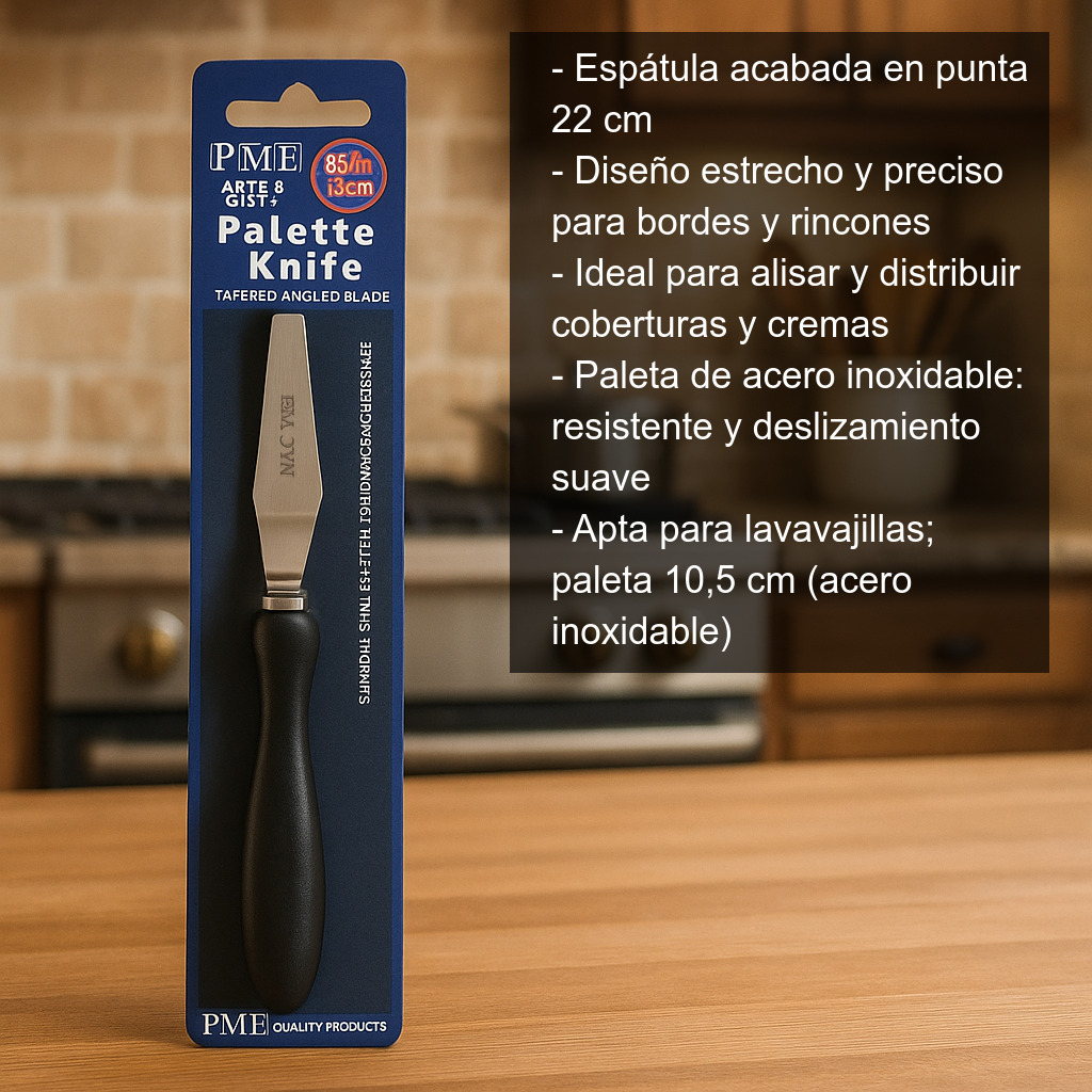 La espátula acabada en punta de 22 cm es un utensilio imprescindible para repostería y decoración de tartas. Su diseño estrecho y preciso permite trabajar con comodidad en superficies pequeñas y llegar a bordes y rincones con facilidad, logrando un acabado más uniforme y profesional.