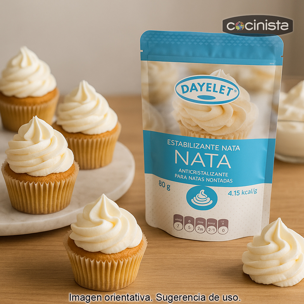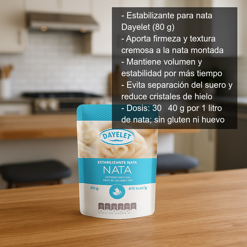 Consigue una nata montada firme, estable y con textura cremosa durante mucho más tiempo con el Estabilizante para nata Dayelet (80 g). Este ingrediente profesional está diseñado para mejorar la consistencia de la nata, ayudando a que mantenga su volumen y estructura sin bajarse, incluso en elaboraciones que deban refrigerarse a muy baja temperatura o congelarse.