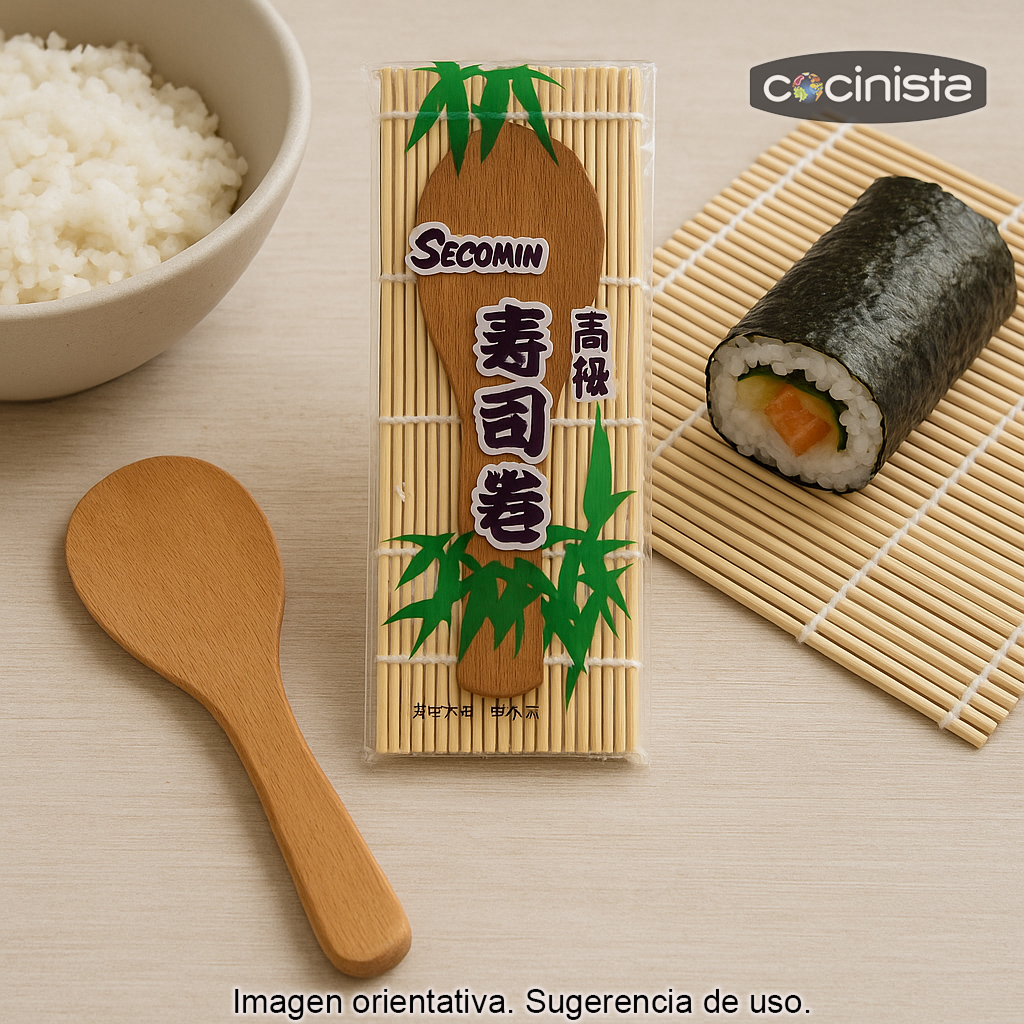 Un set práctico y tradicional para quienes quieren iniciarse o mejorar su técnica en la elaboración de sushi casero, con utensilios pensados para trabajar el arroz y enrollar makis de forma cómoda y precisa.