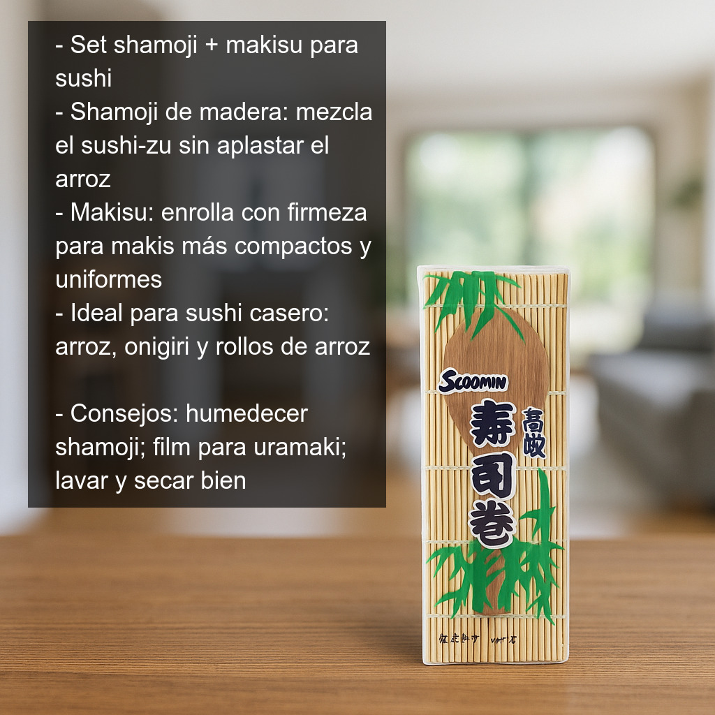Prepara sushi en casa con este conjunto imprescindible formado por una espátula para arroz (shamoji) y una esterilla para sushi (makisu). Dos utensilios tradicionales que se usan en Japón para trabajar el arroz y dar forma a los rollos con facilidad, logrando un resultado más uniforme y profesional.