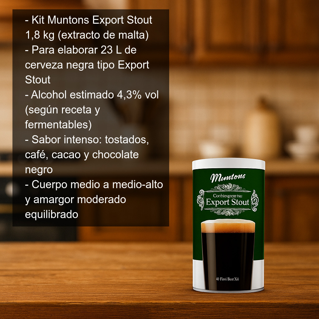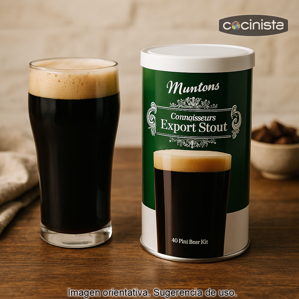 Cerveza negra tipo Export Stout de sabor intenso, excelente cuerpo y perfil tostado. Este kit de extracto de malta de 1,8 kg está diseñado para elaborar en casa una stout de inspiración británica/irlandesa, con un equilibrio muy atractivo entre dulzor de malta y un amargor moderado. Sírvela bien fría para apreciar al máximo su carácter, aunque también gana complejidad si la disfrutas ligeramente menos fría (estilo pub) para que se expresen mejor las notas tostadas.