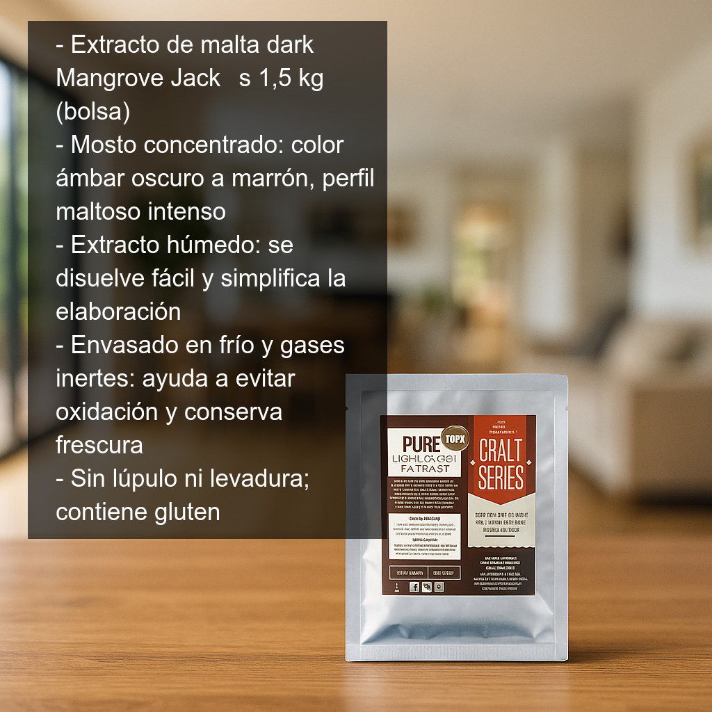 El extracto de malta dark (oscuro) Mangrove Jack’s en formato bolsa de 1,5 kg es una base de mosto concentrado ideal para elaborar cerveza casera con perfiles más intensos, aportando color ámbar oscuro a marrón y un carácter maltoso más marcado. Al tratarse de un extracto de malta húmedo, se disuelve con facilidad y permite simplificar el proceso de elaboración, siendo una opción excelente tanto para principiantes como para cerveceros que buscan rapidez y consistencia en el resultado.