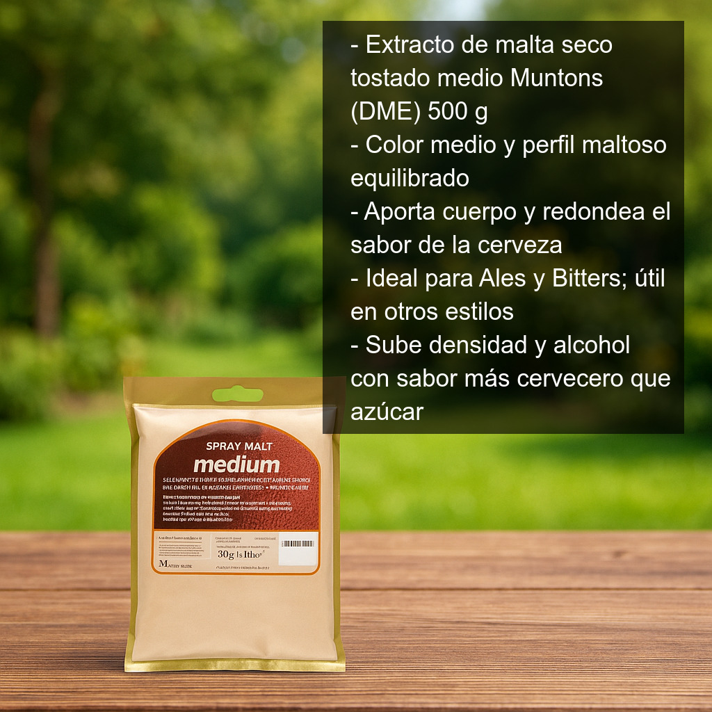 El extracto de malta seco tostado medio (también conocido como DME, Dry Malt Extract) es un ingrediente imprescindible para elaborar cerveza artesana con más facilidad y control. Este extracto de malta en polvo aporta un color medio, mejora el cuerpo y redondea el sabor de la cerveza, ofreciendo un perfil maltoso equilibrado ideal para una gran variedad de estilos.