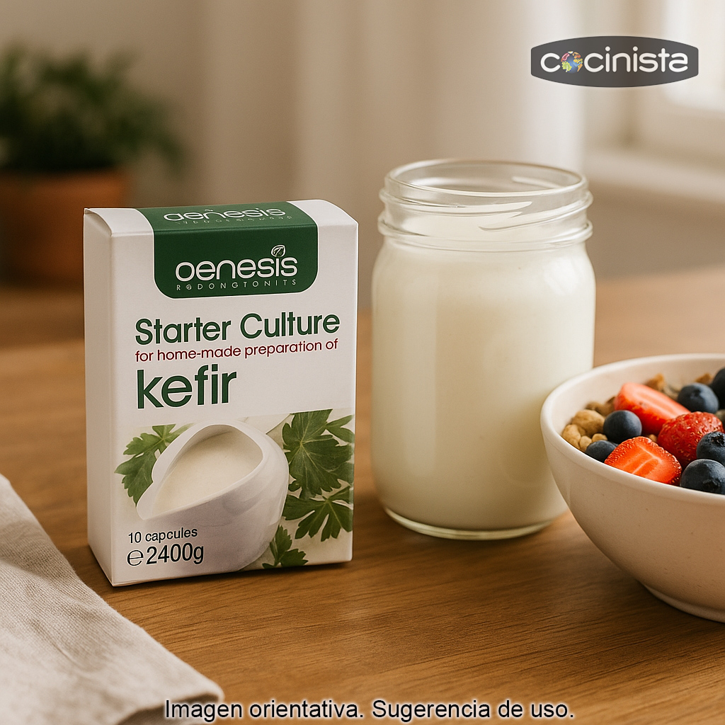 El kéfir es una de las bebidas fermentadas más tradicionales del Cáucaso, apreciada desde hace siglos por su sabor suave y refrescante y por su popularidad dentro de una alimentación equilibrada. Con estos fermentos para hacer kéfir en casa de Genesis Laboratories podrás preparar fácilmente un kéfir tipo yogur de textura ligeramente viscosa y con un punto de dulzor natural, ideal para tomar solo, con fruta, miel, cereales o para usar en recetas.