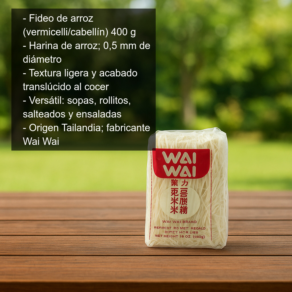 Fideo de arroz (vermicelli o fideo cabellín) 400 g, elaborado con harina de arroz. Con solo 0,5 mm de diámetro, estos fideos ultrafinos se caracterizan por su textura ligera y su acabado translúcido una vez cocidos. Son una opción ideal para quienes buscan una pasta asiática rápida de preparar y muy versátil en cocina.