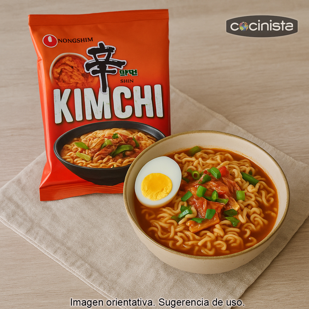 El kimchi es uno de los sabores más emblemáticos de Corea: una preparación fermentada a base de verduras (habitualmente col) con chile y especias, conocida por su carácter intenso, ligeramente ácido y especiado. En esta versión, ese perfil se traslada a un caldo sabroso y picante que realza los fideos y aporta una experiencia muy auténtica para los amantes de la gastronomía asiática.