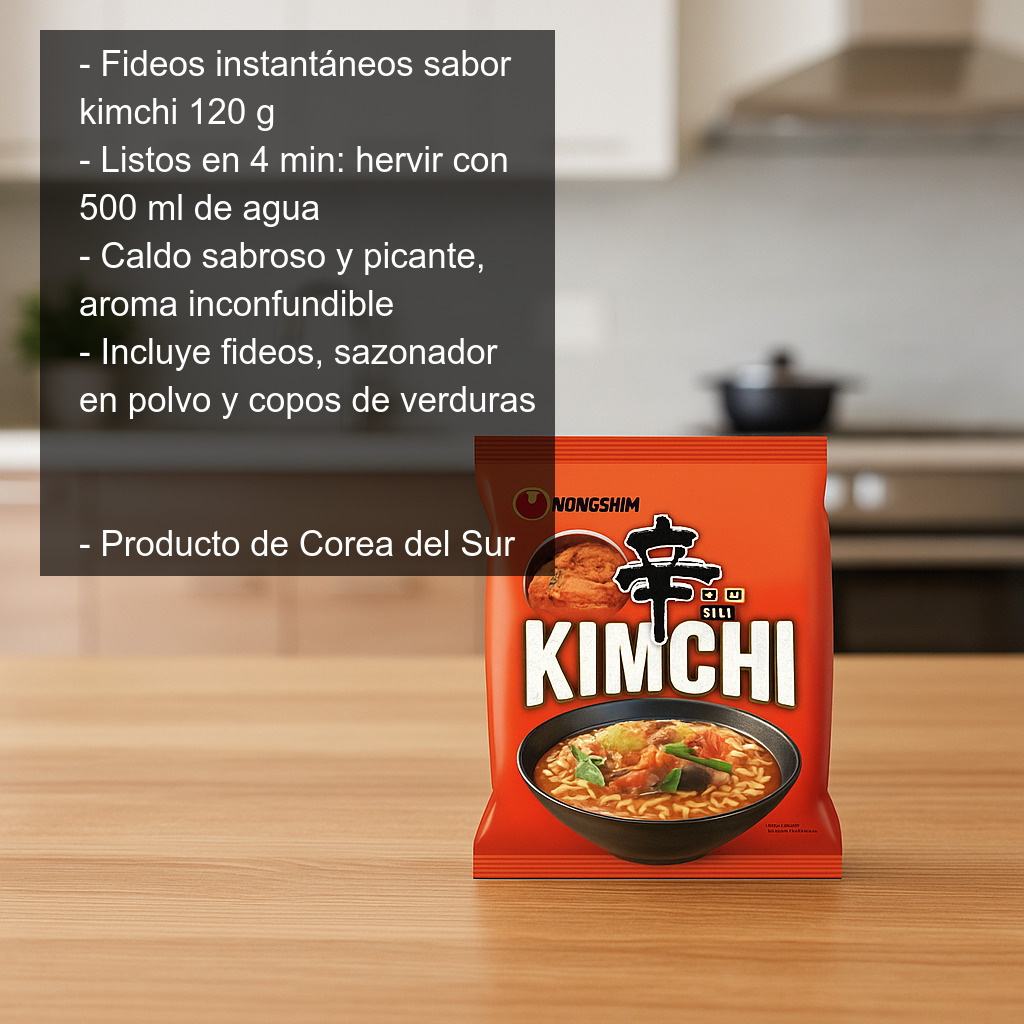 Disfruta en casa de un clásico de la cocina coreana en formato rápido y delicioso con estos fideos instantáneos con sabor a kimchi (120 g). Un plato reconfortante, con un toque picante y un aroma inconfundible, ideal para una comida exprés, una cena ligera o para llevar al trabajo. Al prepararse con 500 ml de agua, la cantidad resultante puede ser suficiente para 1, 2 o incluso 3 personas, según el apetito o si lo sirves como acompañamiento.